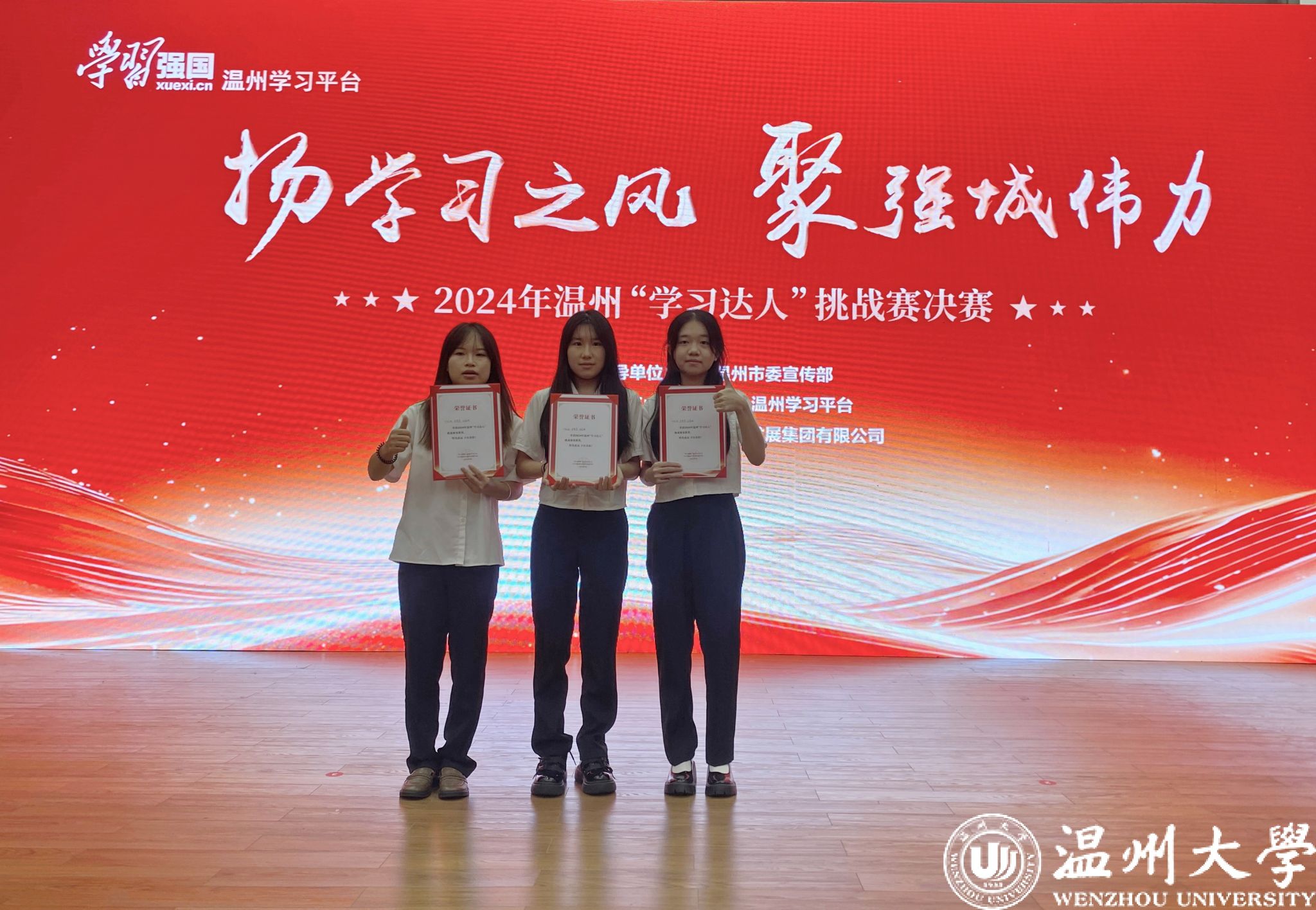 扬学习之风,聚强城伟力。9月4日,2024年温州“学习达人”挑战赛决赛在温州市民中心激情开赛。温大3名学子组成的“文达队”入围决赛并获挑战赛优胜奖,8868体育_8868(中国)获挑战赛优秀组织奖。会议还表彰了年度先进组织和个人,中共8868体育_8868(中国)资产经营公司总支委员会获2023年度“学习强国”温州学习平台“学习之星”先进组织。
