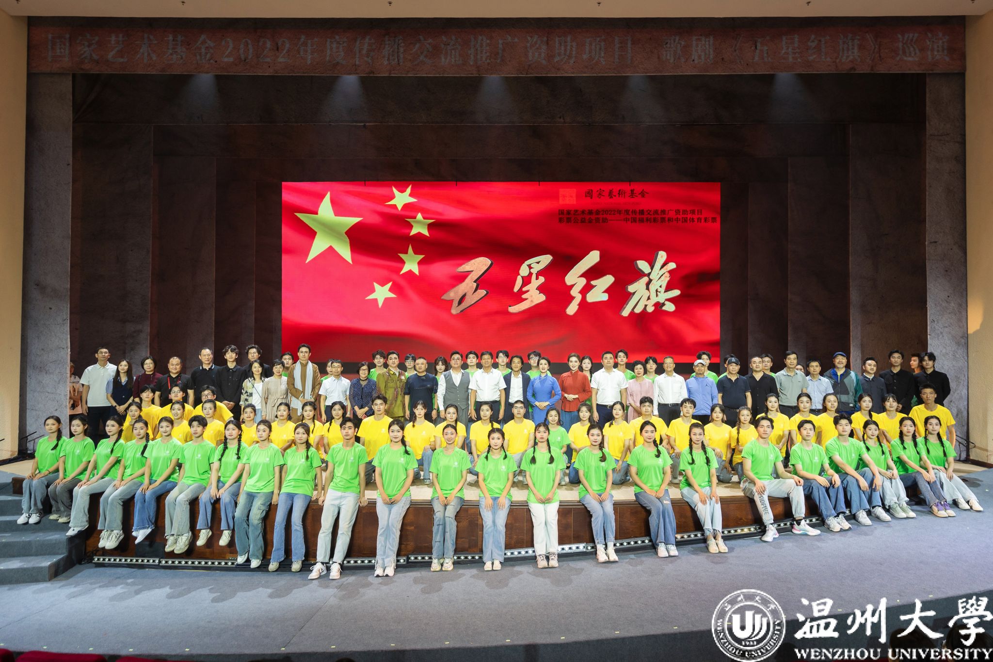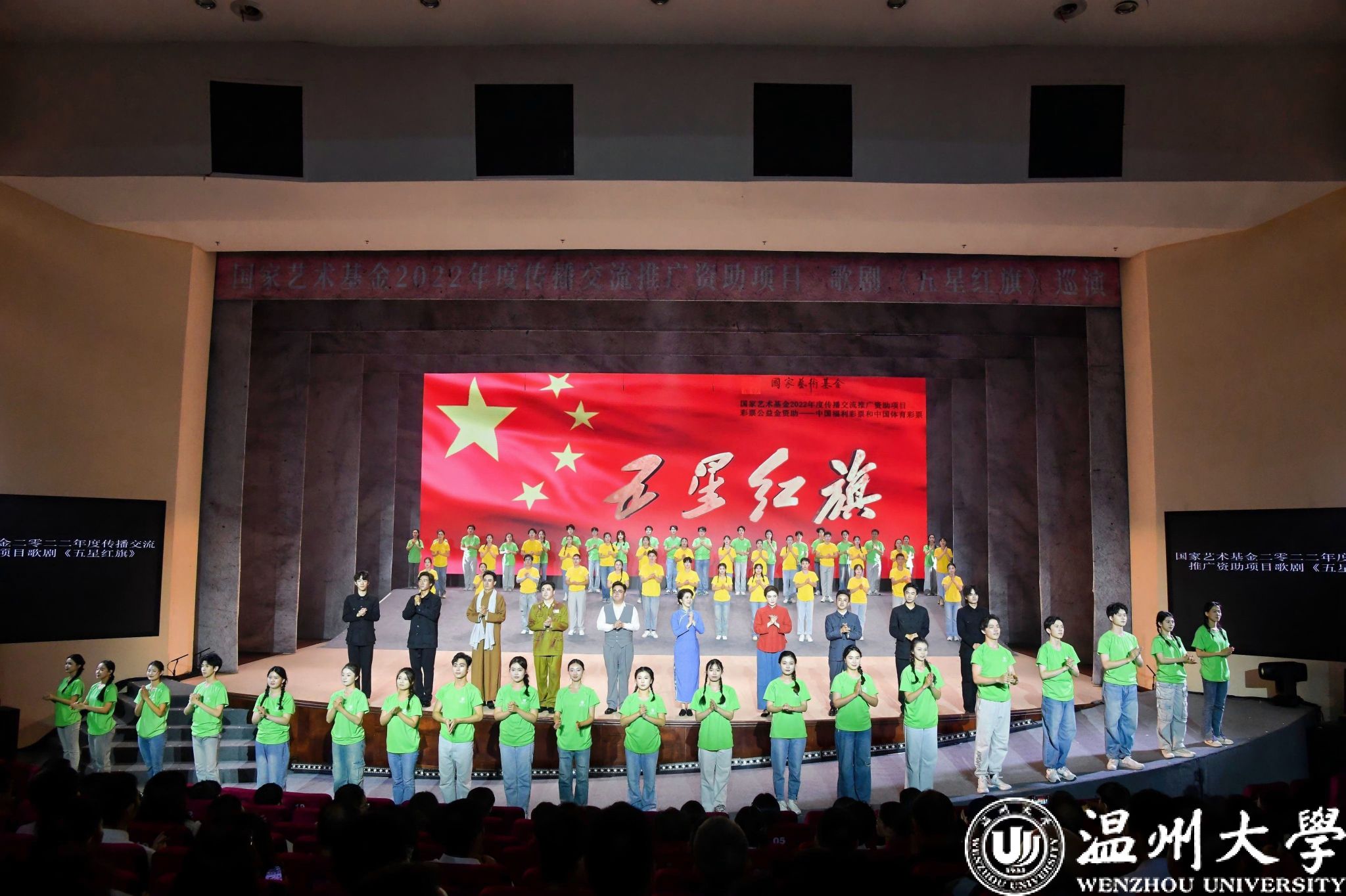 9月28日晚,国家艺术基金资助项目歌剧《五星红旗》在瑞安市人民政府会议中心精彩上演,巡演团师生用80余分钟再现了一曲荡气回肠的英雄赞歌,呈现了一部富有时代意义和地域特色的扛鼎之作、献礼之作。温州市委教育工委专职副书记、市教育局党委副书记张维凯、8868体育_8868(中国)党委副书记庄兴忠、8868体育_8868(中国)原党委副书记、教育发展基金会理事长牟德刚、8868体育_8868(中国)党委委员、组织部部长夏春雨、中共瑞安市委常委、宣传部部长孙寒星、参加新时代艺术思政教育研讨会的专家学者及广大市民1500余人现场观看演出。