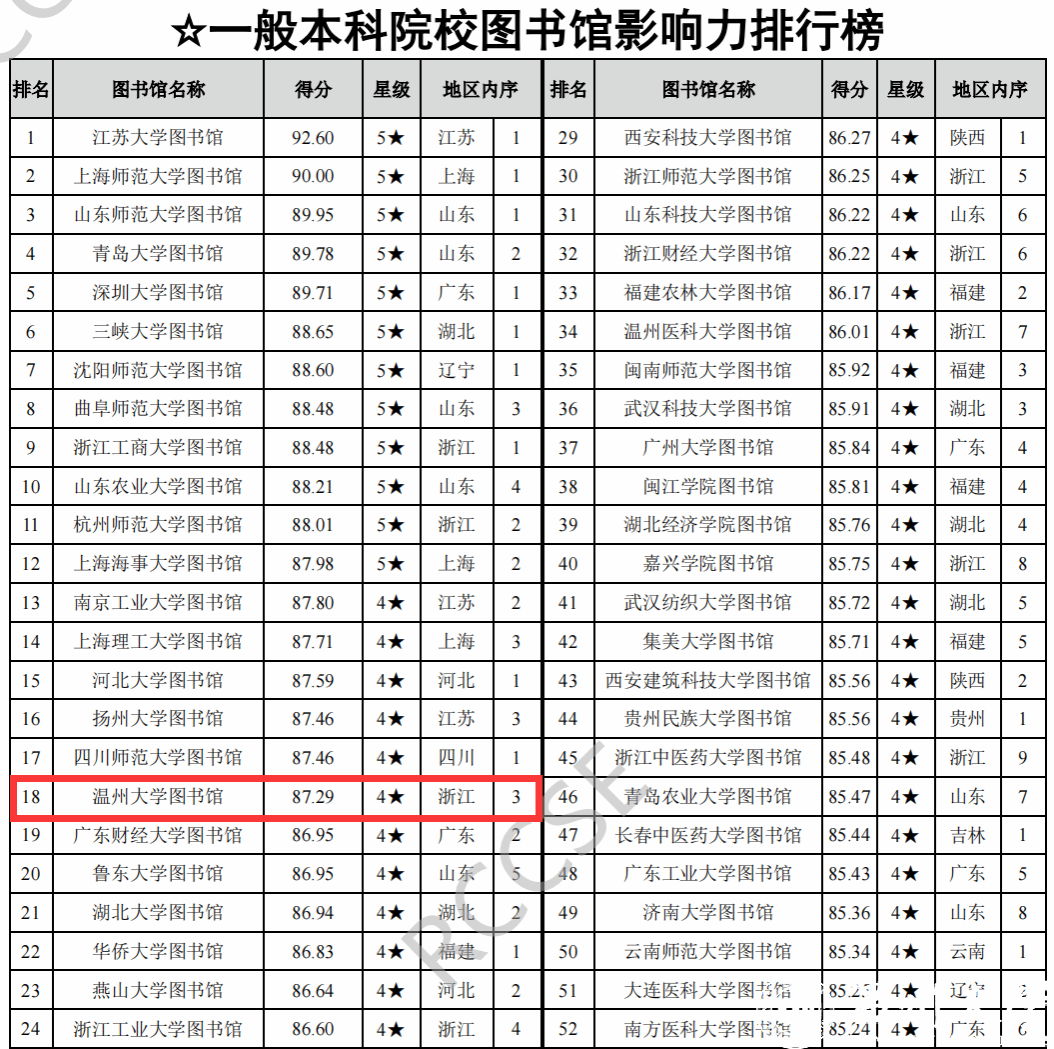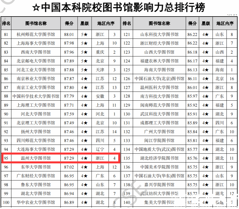 该报告对我国2820所普通高校图书馆(包括1275所本科院校图书馆以及1545所高职高专院校图书馆)、1980家公共图书馆和399家专业图书馆进行评价,从地区、院校类型、图书馆类别等多个维度共产生了18个排行榜,多层次、全方位地展示我国不同类型图书馆影响力。8868体育_8868(中国)图书馆获评4星图书馆,位列“中国本科院校图书馆影响力总排行榜”第95名(浙江省第4名),“一般本科院校(非双一流)图书馆影响力排行榜”第18名(浙江省第3名)。