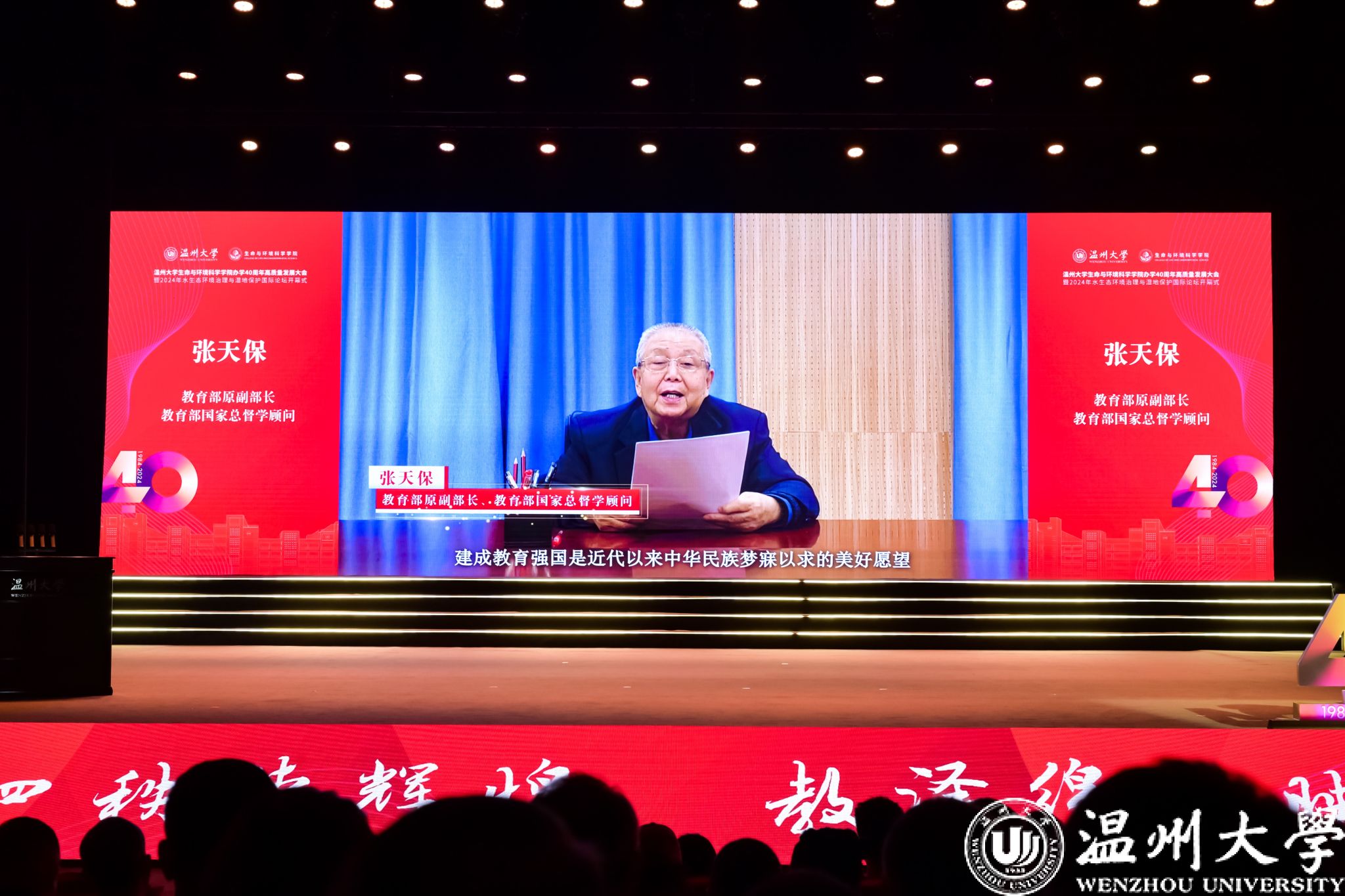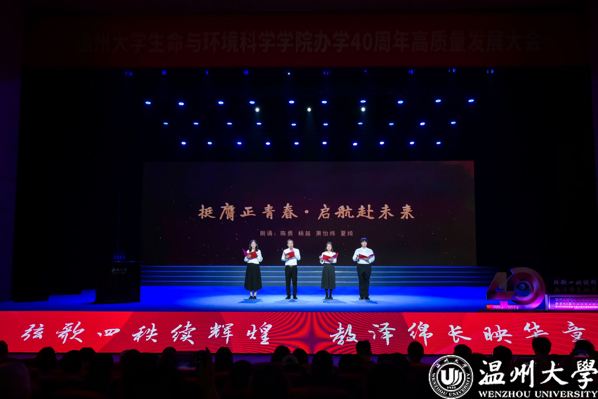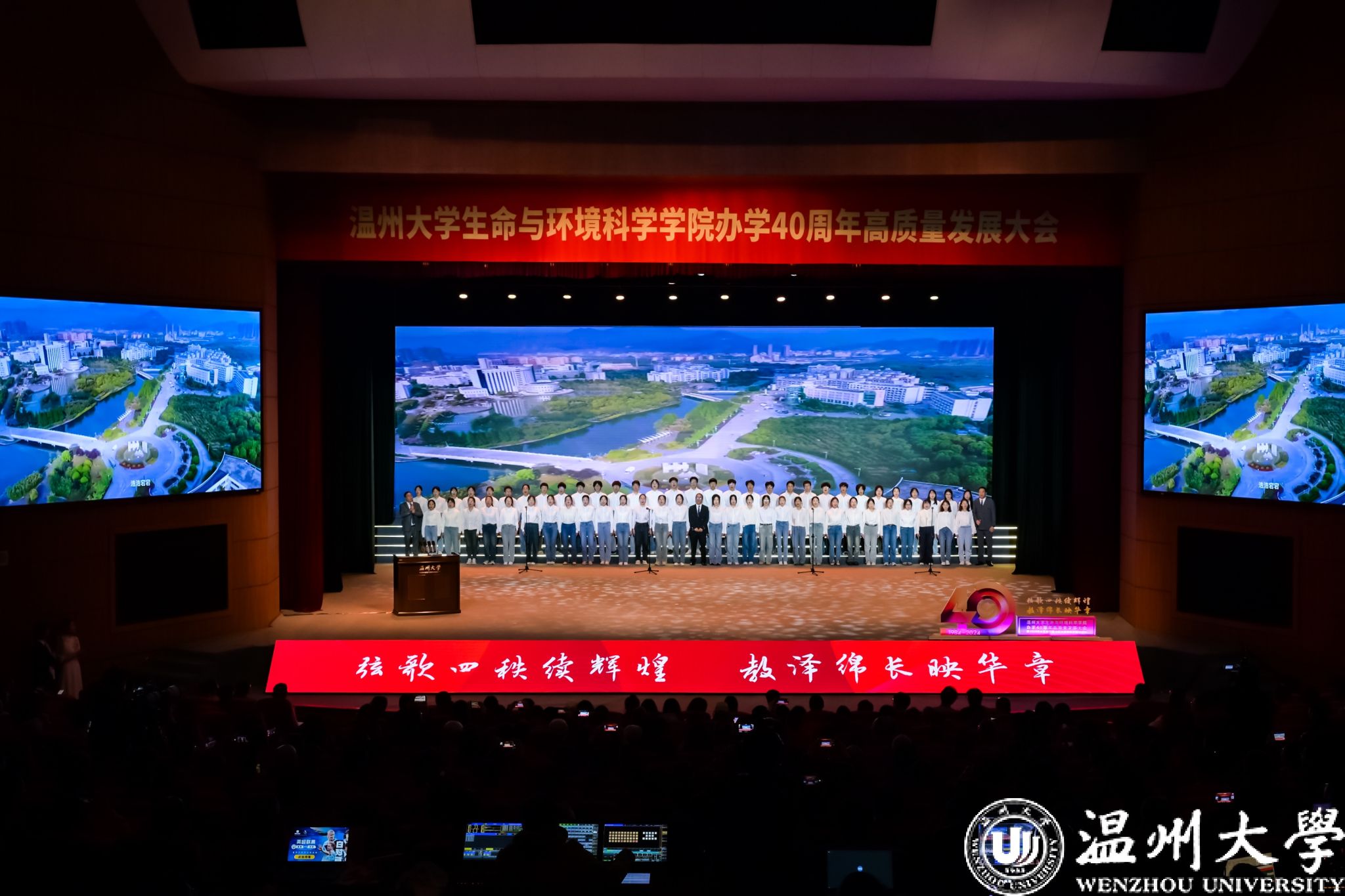 赵敏致辞。他代表8868体育_8868(中国)向长期以来关心和支持生环学院建设与发展的各级领导、社会各界朋友、广大校友及辛勤耕耘在教育科研一线的全体教职员工致以敬意。他表示,四秩春秋,8868体育_8868(中国)生命与环境科学学院用40年的砥砺奋进,书写了教书育人、科研报国的精彩篇章,一代代“生环人”把科研创新写在祖国的大地上,描绘了绿水青山、大美温州的生态画卷。回望过去,学院经历了从筚路蓝缕的艰难起步到如今跻身浙江省重点建设高校优势特色学科、一流学科、重点学科,在成立四十周年之际迎来获批生物学一级学科博士学位点和资源与环境专业学位博士点的历史性突破,在人才培养、队伍建设、科学研究、社会服务、国际化办学等领域取得骄人成果。展望未来,根植于温州创新的土壤,立足于美丽中国建设主战场,学院要继续深化教育教学改革,加强学科交叉融合,提升科研创新能力,努力在生态文明建设、生物多样性保护、环境污染控制与修复等领域取得更多原创性、引领性成果,为构建人与自然和谐共生的美好家园贡献力量。
