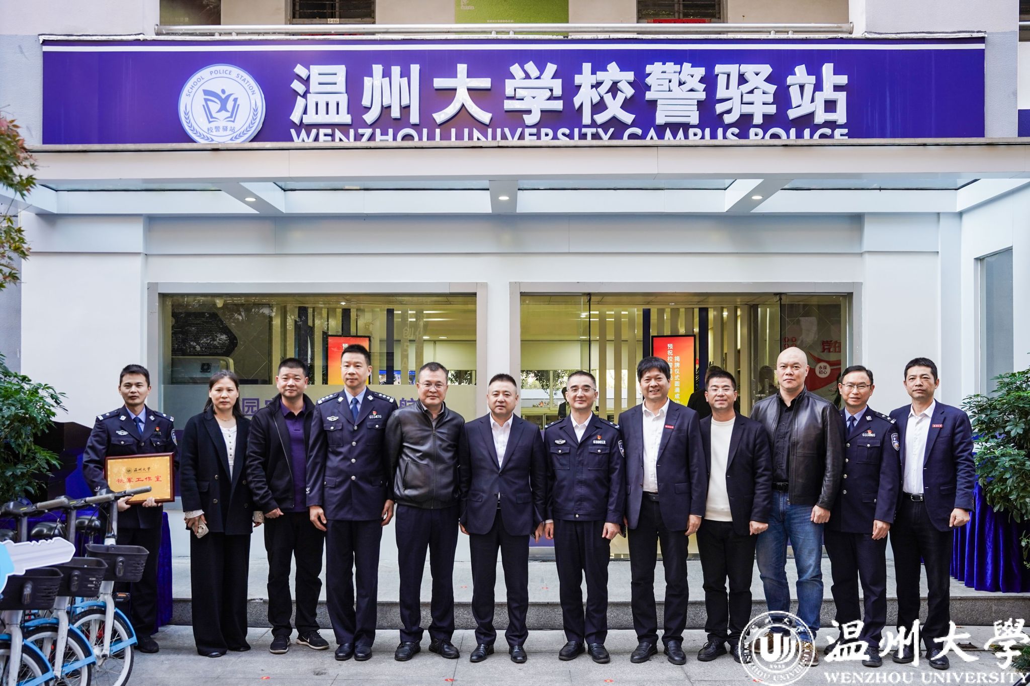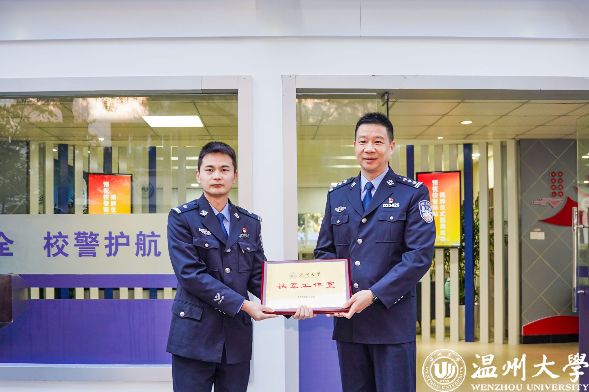 为进一步加强校地联系,强化校警驿站各项职能,校安全保卫部和茶山派出所共同成立了以史铁军警长命名的“铁军”工作室品牌,助力校园安全工作。仪式上,瓯海区公安分局张斌委员为史铁军警长授牌。