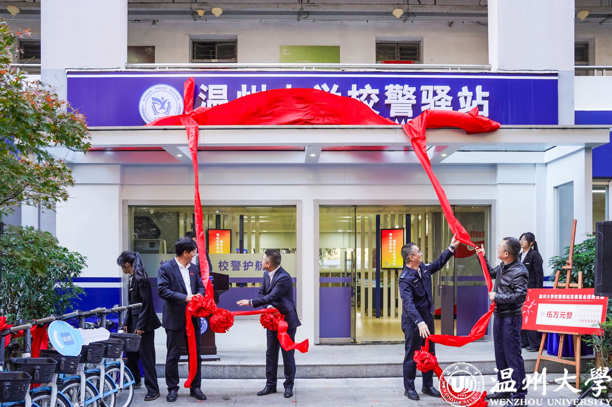 现场还举行了校教工平安校园督察团聘任、校警驿站发展基金捐赠和合作企业捐赠助力电动车仪式。