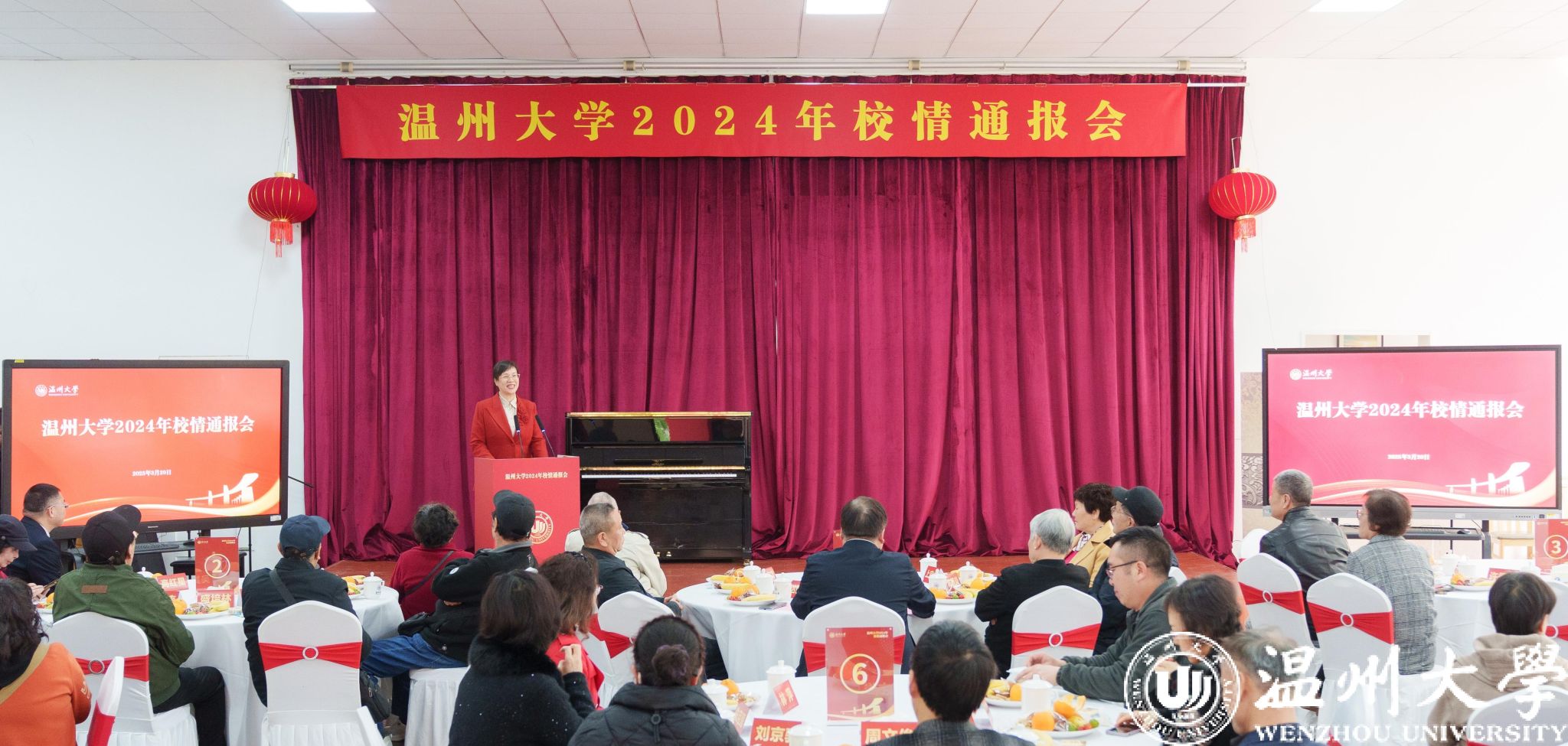 赵敏作校情通报。他指出,2024年全体温大人牢记殷殷嘱托,聚焦“五个着力”,全面推进“锚定5133,奋进2024”工作主题主线,各项事业发展取得丰硕成果。围绕党建引领更加坚强有力、学科建设动力更加强劲、人才培养成效更加凸显、师资队伍结构更加优化、科研创新成果更加丰硕、服务地方举措更加高效、开放办学推进更加深入、校园文化建设更加完善、服务师生需求更加彰显等九个“更加”通报了过去一年学校各项工作情况。