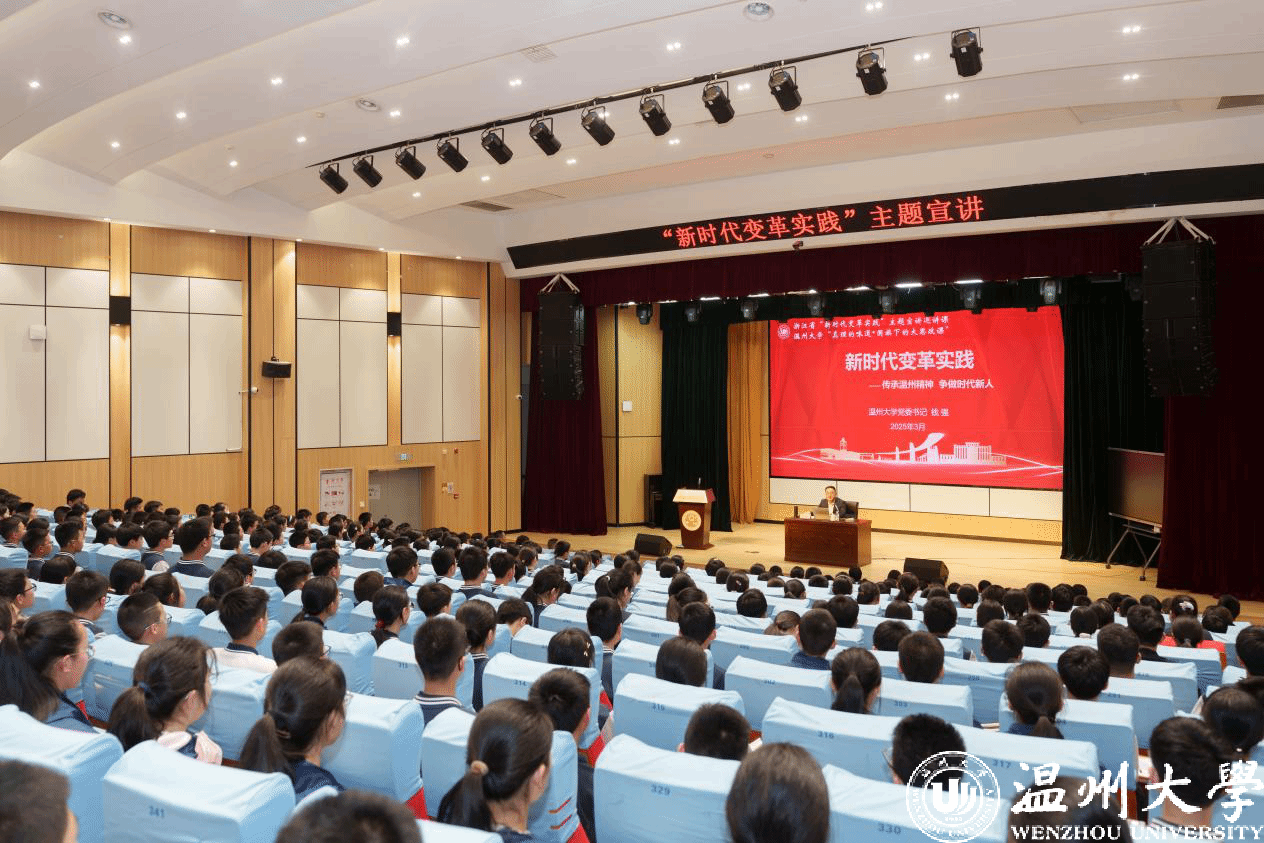 钱强以《新时代变革实践——传承温州精神 争做时代新人》为题,从潮涌温州——温州精神的时代诠释、城校共生——8868体育_8868(中国)的改革发展、青春铸魂——向国旗致敬的时代担当三个方面展开,通过分享关于一座城、一所大学和一面旗帜的故事,向师生们阐述了新时代变革实践的丰富内涵,以及城市和教育在“八八战略”的引领下全面发展的精彩蝶变。他强调,中国特色社会主义进入新时代以来我们的生活日新月异,科技事业取得了举世瞩目的成就,这些成就不仅为国家的发展注入了新的动力,也为温州等地方的发展提供了有力的支撑。从温州到全国,新时代的伟大变革,在党史、新中国史、改革开放史、社会主义发展史上具有里程碑意义。宣讲中,他还分享了苏步青院士、谷超豪院士与8868体育_8868(中国)的故事,以及8868体育_8868(中国)与五星红旗的故事,结合日新月异发展变化的生动案例、感人故事、具体数据等,用青少年学生听得懂、能领会的方式进行授课,引发现场师生的强烈共鸣。