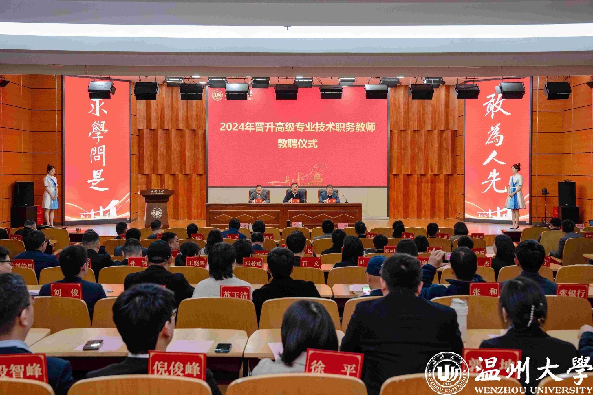 钱强作总结讲话。他指出,获聘高级专业技术职务,不仅是一份喜悦和光荣,更是一份责任和承诺。他强调,广大教师要进一步落实立德树人根本任务,做好铸魂育人的典范。牢固树立“以生为本”的理念,大力弘扬“教育家精神”,争做“大先生”,严于律己修身,做到“学高为师、身正为范”。要进一步树立高远奋斗目标,做实深耕教育的标兵。一如既往保持拼劲、冲劲、闯劲,不断追求卓越,争做大师、名师,服务学校教育事业发展大局。要进一步服务地方社会发展,做强校地联动的先锋。“顶天”“立地”服务地方社会发展,为温州提速打造全省“第三极”发出温大声音、贡献温大智慧、提供温大方案。他希望,大家坚守教育初心、不忘育人使命,与学校共发展、同奋进,双向奔赴、共同赋能,奋力书写光辉绚丽的新篇章!