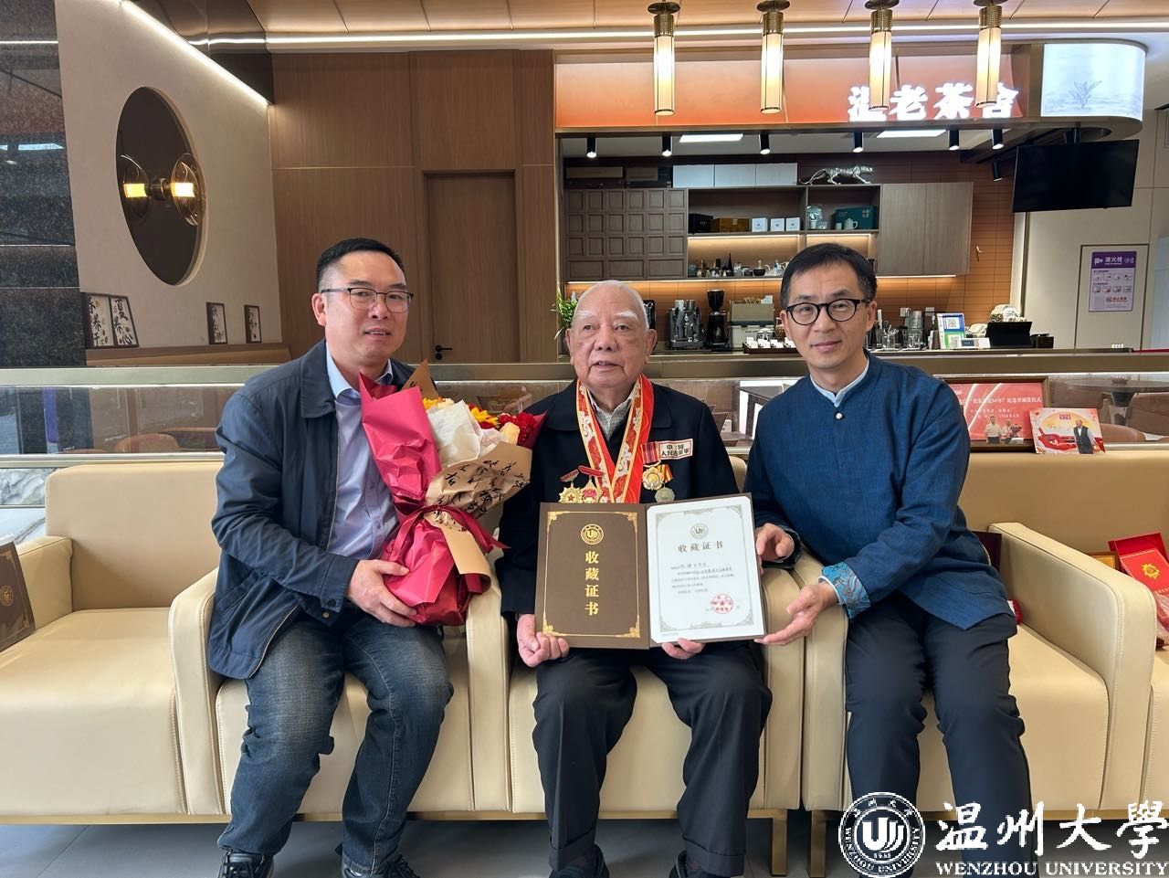 4月6日上午,8868体育_8868(中国)离退休工作处、校史博物馆相关老师前往温州老年病医院拜访温大离休老同志张棣生先生,接受张老捐赠的志愿军布质胸标、纪念徽章、《志愿军》报纸、志愿军后勤司令部餐券等“红色档案资料”,并向张老颁发8868体育_8868(中国)校史博物馆收藏证书,感谢张老将珍藏七十多年的心爱之物捐赠给学校。
