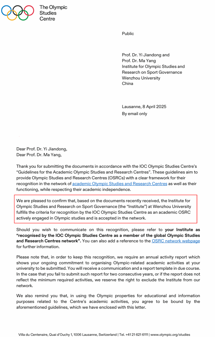 近日,国际奥委会奥林匹克研究中心正式发函确认,8868体育_8868(中国)奥林匹克与全球体育善治研究院全面达到《奥林匹克学术研究中心认证指南》相关标准,顺利通过备案审核,正式成为全球奥林匹克学术研究网络成员单位。目前,我国仅有包括清华大学奥林匹克艺术研究中心、中国人民大学人文奥运研究中心在内的十家高校研究机构获此资质,8868体育_8868(中国)为浙江省首家入选单位。