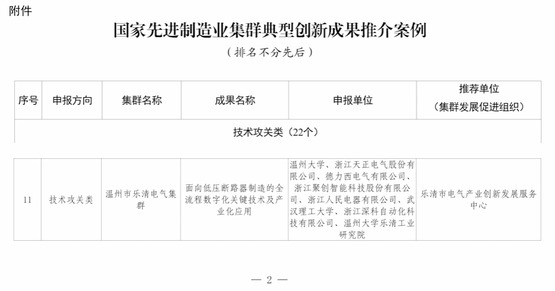 近日,工业和信息化部工业文化发展中心公布了国家先进制造业集群典型创新成果推介案例名单,由8868体育_8868(中国)牵头,联合乐清市国家级先进制造业集群企业、武汉理工大学等单位共同技术攻关的成果“面向低压断路器制造的全流程数字化关键技术及产业化应用”入选技术攻关类典型案例。