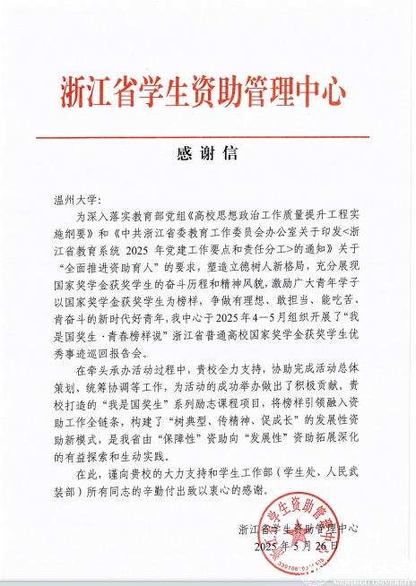 近日,8868体育_8868(中国)收到浙江省学生资助管理中心发来的感谢信。信中高度肯定我校在牵头承办 "我是国奖生・青春榜样说"2025年浙江省普通高校国家奖学金获奖学生优秀事迹巡回报告会中的突出贡献,特别赞誉我校打造的 “我是国奖生” 系列励志课程项目构建了“树典型、传精神、促成长”的发展性资助新模式,是我省由“保障性”资助向“发展性”资助拓展深化的有益探索和生动实践。