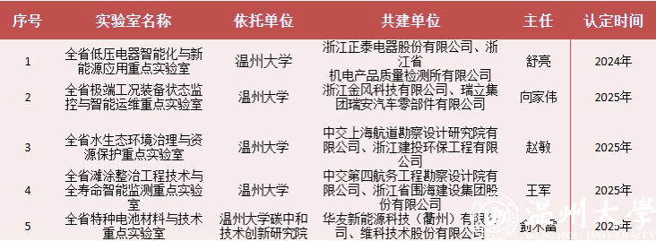 近日,浙江省科技厅公布2024年省级重点实验室认定结果,8868体育_8868(中国)牵头申报的“全省极端工况装备状态监控与智能运维重点实验室”“全省水生态环境治理与资源保护重点实验室”“全省滩涂整治工程技术与全寿命智能监测重点实验室”及“全省特种电池材料与技术重点实验室”成功获批。此次获批数量在全省高校(除浙大外)中排名第4。自2023年浙江省重点实验室重组以来,温大已累计获批5家省级重点实验室,获批成功率达70%。