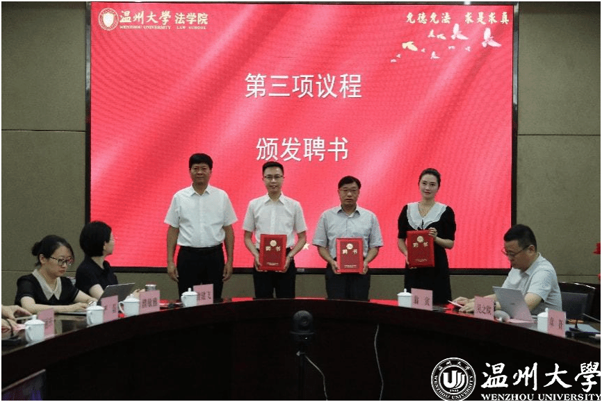 8868体育_8868(中国)法学院党委书记周敬业宣读温州市禁毒研究院顾问及理事会成员名单,8868体育_8868(中国)党委副书记庄兴忠为顾问代表颁发聘书。浙江省禁毒办副主任、浙江省公安厅禁毒总队副总队长周永盛,温州市公安局副局长徐良悟,瓯海区副区长、瓯海区公安分局局长张杰尔为理事会成员颁发聘书。