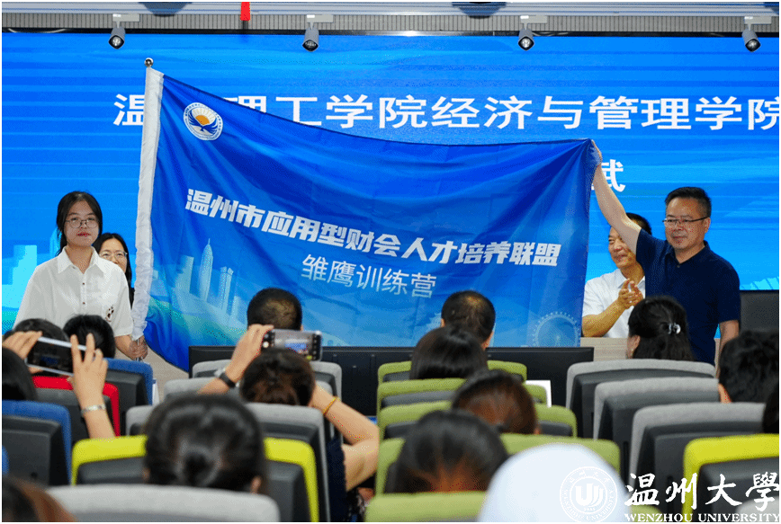 仪式上,师生代表签署入营承诺书。随后,温州市会计学会会长林江帆、温州市注册会计师协会会长张国光等领导为32位校外导师颁发聘书。授旗环节将气氛推向高潮。温州理工学院经管学院党委书记朱斌将营旗授予学员代表郑乐乐,象征“雏鹰”使命的传承。