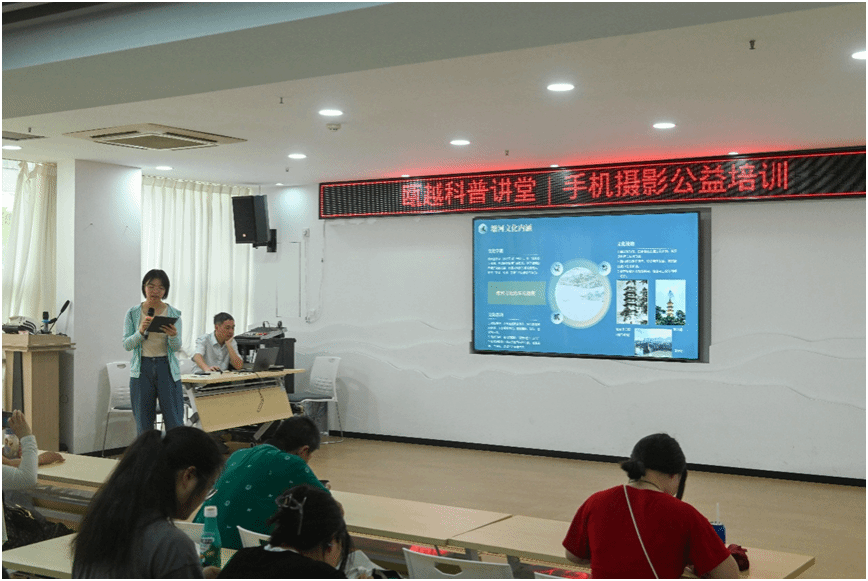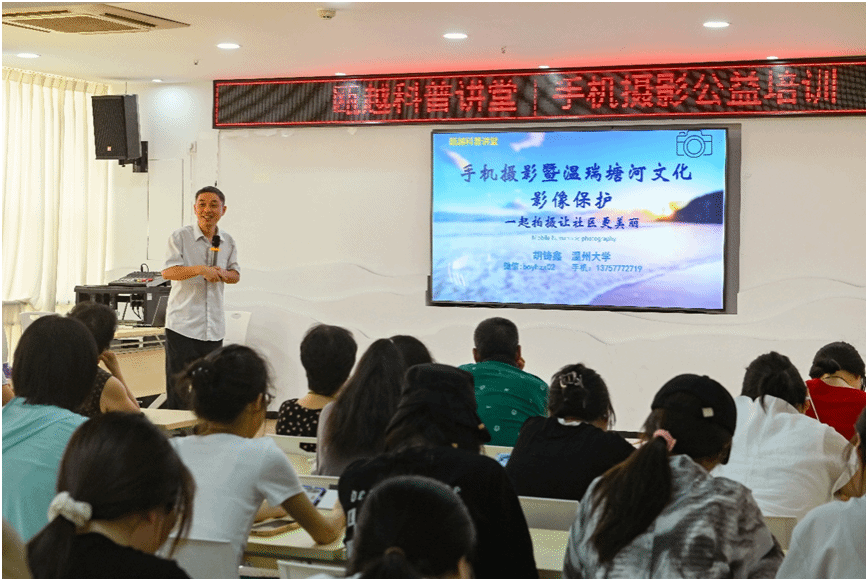 温州市科普品牌活动“瓯越科普讲堂”谱新章,近日,一场聚焦温瑞塘河流域水文化数字化保护与手机摄影美学的创新融合讲座在8868体育_8868(中国)城高教博园社区党群服务中心成功举办。本次瓯越科普讲堂以“用镜头留住塘河韵,以美学守护生态美”为主题,由中国图象图形学会图像应用与系统集成专业委员会,数字文化遗产专业委员会、温州市科学技术协会、博园社区、8868体育_8868(中国)数智青荷实践队、宋韵塘河实践队、生环学院文达清源实践队联合主办。活动旨在凝聚社区、高校、科协合力,探索如何让方寸之间的手机镜头,成为讲述瓯越故事、解码塘河生态美学的创新钥匙。