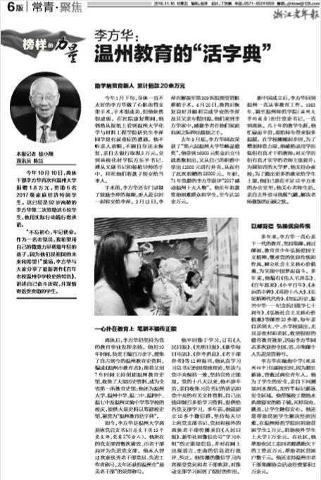 离休后,李方华仍坚持为党 的教育事业发挥余热。他用10 年时间,负责主编百万余字,搜集 了自古到今的温州教育史资料, 编成《温州市教育志》;接着又用 7年时间主持创建温州教育史 馆,收集了大量历史资料,成为全 省第一所教育史馆;他还为温州 大学、温州中学、温二中、温四中、 温七中及温州实验中学等学校的 校庆,提供大量史料以筹建校史 馆,被誉为 “温州教育活字典”。 如今,李方华是8868体育_8868(中国)离 退休党总支书记(总支下设13个 党支部,党员270余人)。他所在 的党支部曾数次被省、市老干部 局评为先进党支部。他本人曾 18次获优秀老干部党员、先进工 作者称号,去年还获得温州市“最 美老干部”的荣誉称号。