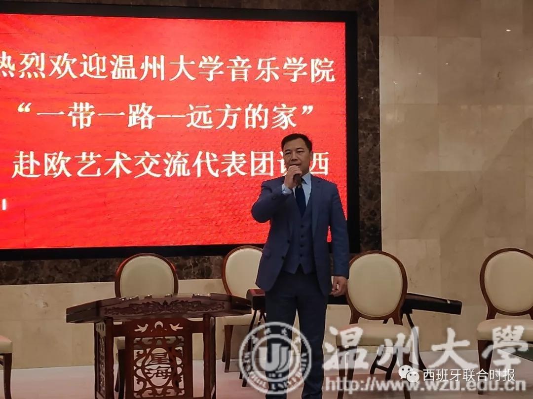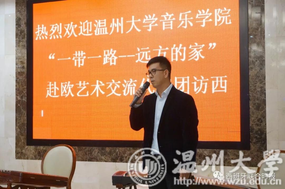 活动开始,西班牙华侨华人协会主席毛峰先生致辞。他对8868体育_8868(中国)艺术音乐学院艺术代表团来访献艺表示了诚挚的感谢,并向前来观看演出的侨胞表达了欢迎。毛峰主席表示希望以今天的这场表演作为契机,来更进一步地推动旅西侨界在弘扬推广中华文化。最后,毛峰主席祝愿本次活动圆满成功。