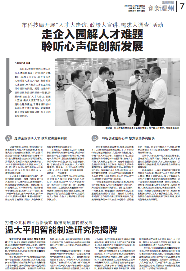 目前,研究院整合自身人才资源和与平阳企业已有合作的专家资源,引进新能源与智能车辆技术研发团队、材料成型与金属3D打印技术研发团队、先进激光加工技术与装备研发团队、生物医学检测与传感技术研发团队、故障诊断与可靠性设计研发团队、新能源与智能车辆技术研发团队、智能制造系统与工业自动化团队共6 个人才团队,帮助本地企业提升产品智能化程度,推动制造智能化,提升企业生产效能。