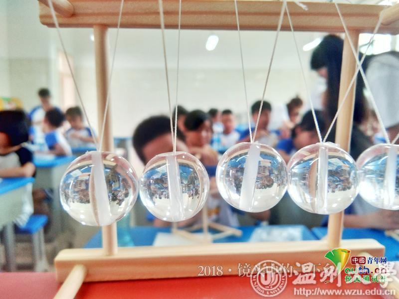 早上,队员们为学员们介绍牛顿摆,首先他们仔细讲解了牛顿摆的原理,紧接着在学员们期盼的眼神中,分发给他们材料,逐步进行组装,期间学员们遇到问题也会请教队员们,队员们也不遗余力的给予帮助。很快,牛顿摆就成型了,随着珠子的摆动孩子们露出来开心的笑脸。中国青年网通讯员 杨婧雯 摄