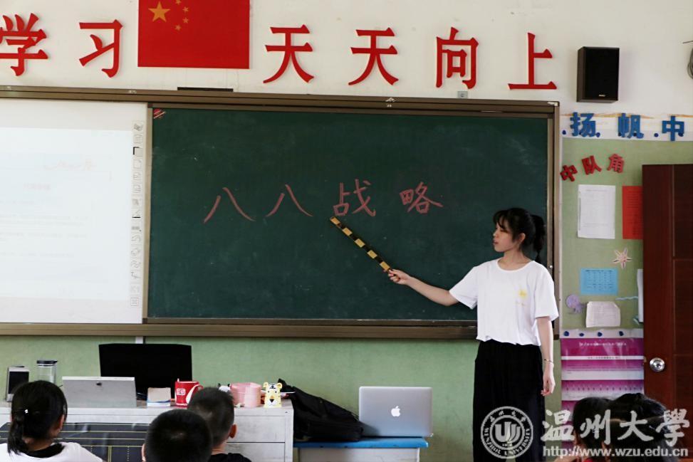 为此,2018年8月1日建军节,在一个声声致敬和慰问伟大而可爱的军人的日子里,8868体育_8868(中国)教师教育学院“知心姐姐”暑期社会实践队的队员们给自己和“小候鸟”们、“小春泥”们准备了一节特别的课程——《八八战略》。