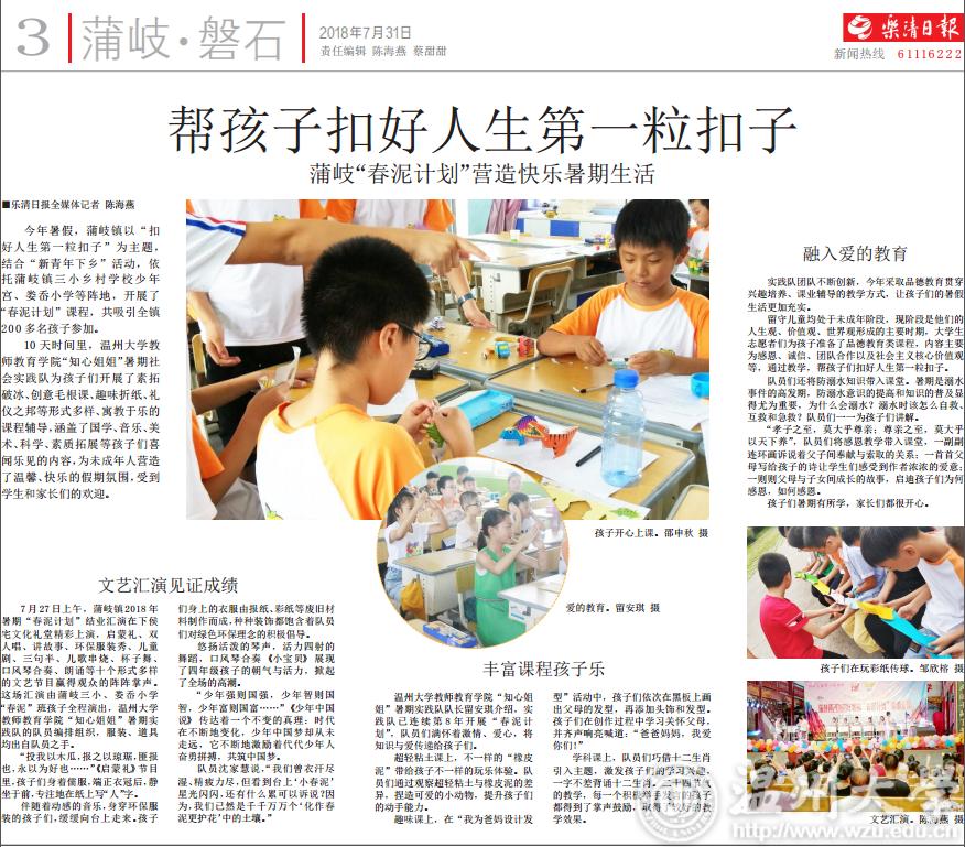 今年暑假,蒲岐镇以“扣好人生第一粒扣子”为主题,结合“新青年下乡”活动,依托蒲岐镇三小乡村学校少年宫、娄岙小学等阵地,开展了“春泥计划”课程,共吸引全镇 200多名孩子参加。10天时间里,8868体育_8868(中国)教 师教育学院“知心姐姐”暑期社 会实践队为孩子们开展了素拓破冰、创意毛根课、趣味折纸、礼仪之邦等形式多样、寓教于乐的课程辅导,涵盖了国学、音乐、美术、科学、素质拓展等孩子们喜闻乐见的内容,为未成年人营造了温馨、快乐的假期氛围,受到学生和家长们的欢迎。