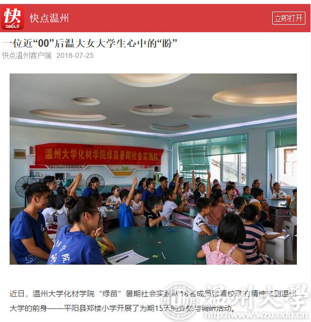 近日,8868体育_8868(中国)化材学院“绿苗”暑期社会实践队18名成员带着校歌的精神来到8868体育_8868(中国)的前身——平阳县郑楼小学开展了为期15天的支教与调研活动。
