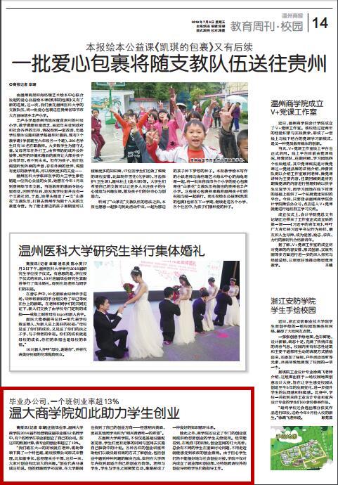 正值毕业季,8868体育_8868(中国) 商学院2014届市场营销应届毕业班52名同学 中,有7名同学在毕业前创立了自己的公司。按 这样的数据计算,该专业的创业率超过了13%。 “我们班在大一的时候就在老师、班助带 领下搞了一个特色班,班级按照公司形式来管 理,比如董事长、总经理来分干部,这样一来, 大家对创业有比较大的兴趣。”创业代表马谦 诚这样说。他的同班同学祁汉锋,在大学期间 也找到了自己的创业方向——经营绍兴黄酒, 更被其他同学戏称为“绍兴黄酒唯一的希望”。 在8868体育_8868(中国)商学院,不仅仅是基础设施配 备完善,学生们更有足够的时间与空间去实施 自己脑袋中的计划。各种各样的创业讲座帮 助他们以最快最有效的方式了解创业,包括创 业中遇到种种问题的解决方法,如何在大学四 年内找到最适合自己的创业方向等。老师与 学生,学生与学生之间频繁互动,渐渐形成了 一种良好的知识循环体系。 除此之外,商学院还设立了专门的创业空 间提供给想要创业的学生无偿使用。经常能 看到,在晚自习的时候,创业空间的灯大亮着, 总会有不同的学生在里面讨论问题,不用走近 就能感受到浓浓的创业激情。由于担心学生 仍然不能很好地与社会创业对接,学院不仅对 内成立了就业部和创业部,还特地聘请校外的 创业导师给学生们做指导工作。