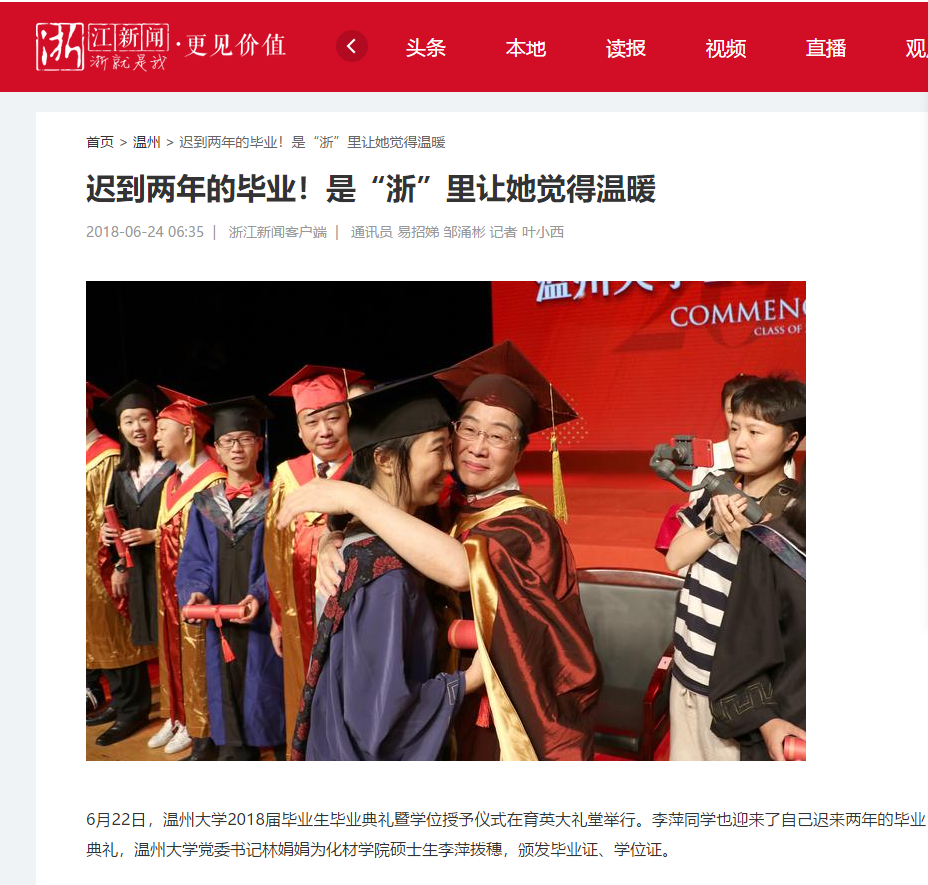 “这个学位证是对我学业上多年努力的肯定,也是我人生中最浓墨重彩的一笔。”拿到学位证书的李萍很是激动。为了能够顺利完成答辩,李萍提前3个月准备毕业论文和答辩书面材料,而学校考虑到她情况特殊,特批通过视频完成答辩。“我很感谢8868体育_8868(中国)老师和同学们对我的关心和帮助,没有你们就没有我的重获新生,真的很庆幸,我来的是浙江温州,读的是温大,‘浙’里让我觉得很温暖!”