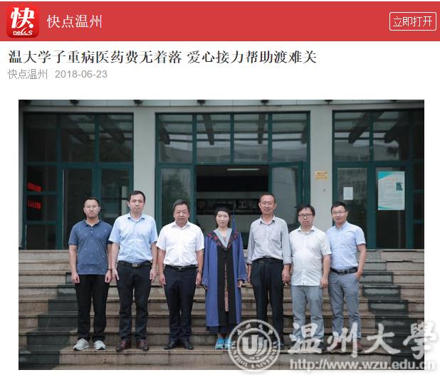 此后,长达两年的时间,既是李萍与病魔抗争的时间,亦是温大师生接力陪跑的时间。温大师生成立了“萍生救助团队”,联系温州都市报、温州市红十字会、温大校友会等社会力量积极募捐,并通过“轻松筹”、亲青筹等平台发起网络爱心募捐,一时间,为李萍捐款的消息瞬间刷爆了朋友圈和空间。91岁高龄的8868体育_8868(中国)原党委书记李方华从报纸上看到李萍的消息当即决定捐赠3万元。最终,学院学校师生及个人、温大校友会、瓯海慈善总会、市红十字会、张汉鸣基金以及爱心市民为李萍募集善款,共计36万元。