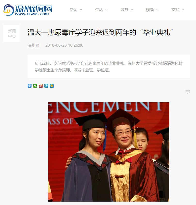 “这个学位证是对我学业上多年努力的肯定,也是我人生中最浓墨重彩的一笔。”拿到学位证书的李萍很是激动。为了能够顺利完成答辩,李萍提前3个月准备毕业论文和答辩书面材料,而学校考虑到她情况特殊,特批通过视频完成答辩。“我很感谢8868体育_8868(中国)老师和同学们对我的关心和帮助,没有你们就没有我的重获新生,真的很庆幸,我来的是温州,读的是温大,这里让我觉得很温暖!”