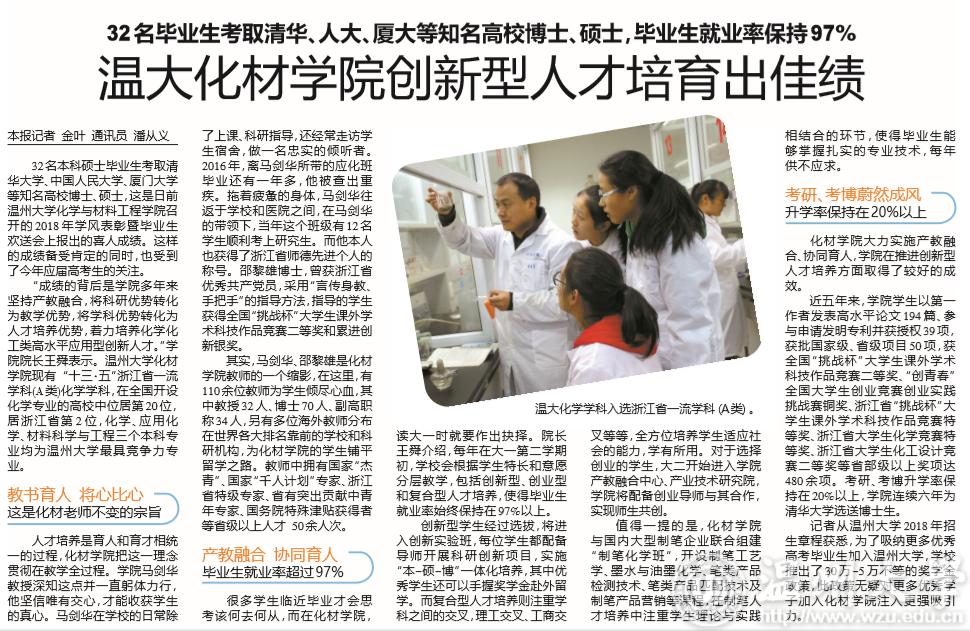 32名本科硕士毕业生考取清华大学 、中国人民大学、厦门大学 等知名高校博士、硕士,这是日前 8868体育_8868(中国)化学与材料工程学院召 开的2018年学风表彰暨毕业生 欢送会上报出的喜人成绩。这样 的成绩备受肯定的同时,也受到 了今年应届高考生的关注。 “成绩的背后是学院多年来 坚持产教融合,将科研优势转化 为教学优势,将学科优势转化为 人才培养优势,着力培养化学化 工类高水平应用型创新人才。”学 院院长王舜表示。8868体育_8868(中国)化材 学院现有“十三·五”浙江省一流 学科(A类)化学学科,在全国开设 化学专业的高校中位居第20位, 居浙江省第2位,化学、应用化 学、材料科学与工程三个本科专 业均为8868体育_8868(中国)最具竞争力专业。