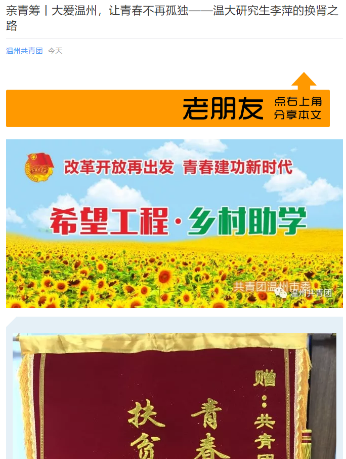 2018年1月22日,就在李萍接受肾移植手术通过医院和有关部门审核,可以安排手术的消息后,温州团市委就在“亲青筹”平台发布了题为《父亲为爱捐肾救女,请帮帮温大这名优秀的学生!》的筹款项目。筹款目标4万元,短短几天时间内,共有719人次参与捐款,共募捐44639.35元。3月13日,该笔款项拨付给了8868体育_8868(中国)教育发展基金会,用于李萍的移植手术和后续治疗。
