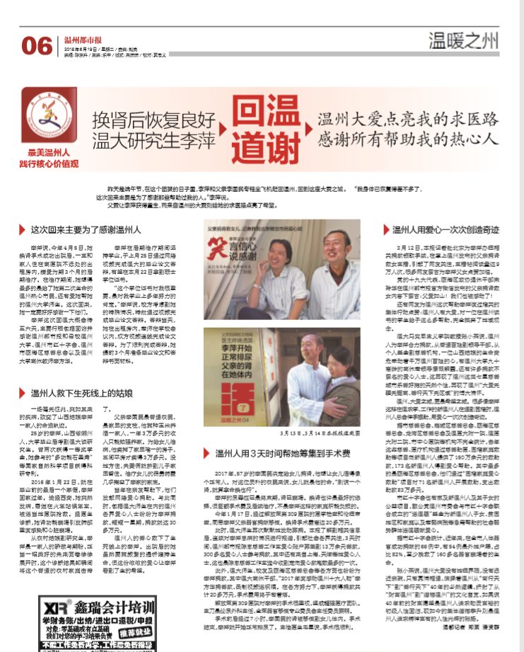 李萍说,今年4月5日,她 换肾手术成功出院后,一直和 家人住在离医院不远处的出 租房内,接受为期3个月的后 期治疗。在治疗期间,她想得 最多的是给了她第二次生命的 温州热心市民,还有爱她帮她 的8868体育_8868(中国)师生。这次回来, 她一定要好好感谢一下他们。 李萍这次回温大概会待 五六天,主要行程包括回访并 感谢温州都市报和母校温州 大学、温州市红十字会、温州 市瓯海区慈善总会以及温州 大学离休教师李方华。