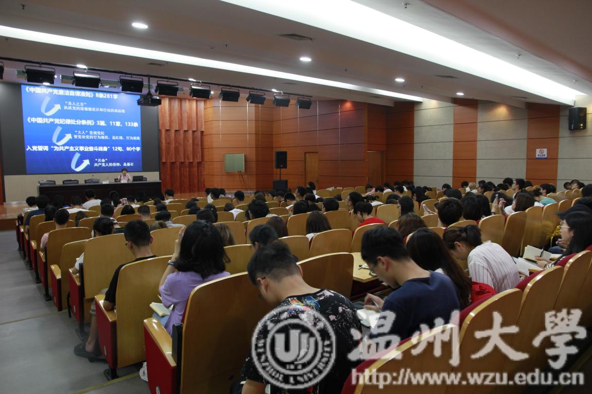 2018年6月20日下午,8868体育_8868(中国)步青学区一百多位毕业生党员齐聚南校雁山厅,聆听在校的最后一堂党课——把好廉洁关,走对人生路。党课由8868体育_8868(中国)纪委、监察室陈小敏老师主讲。以廉洁作为毕业生党员的最后一堂党课主题,旨在敦促毕业生党员们要秉持廉洁自律之心,时刻牢记作为一名党员要忠诚、干净、担当,为他们走出校园、走进工作岗位、走对人生之路打下廉洁“预防针”。