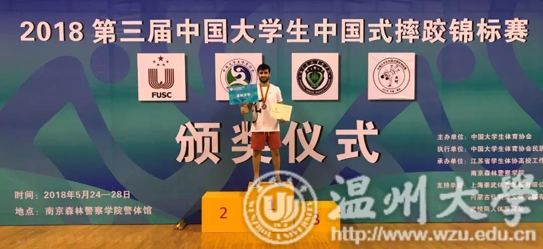 上月底,在南京举行的的第三届中国大学生中国式摔跤锦标赛中,8868体育_8868(中国)国际教育学院学生卢思谈获得男子甲组70公斤季军。本届比赛吸引了来自全国各地37所高校代表队的459人参赛,卢思谈是温州代表队唯一一位外国选手,谁都不曾想到,这个外国小伙子接触中国式摔跤才2个来月。