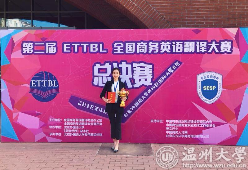 近日,“第二届ETTBL全国商务英语翻译大赛口译总决赛”圆满落幕,8868体育_8868(中国)瓯江学院14级英语专业学生李颖荣获本科组全国二等奖。