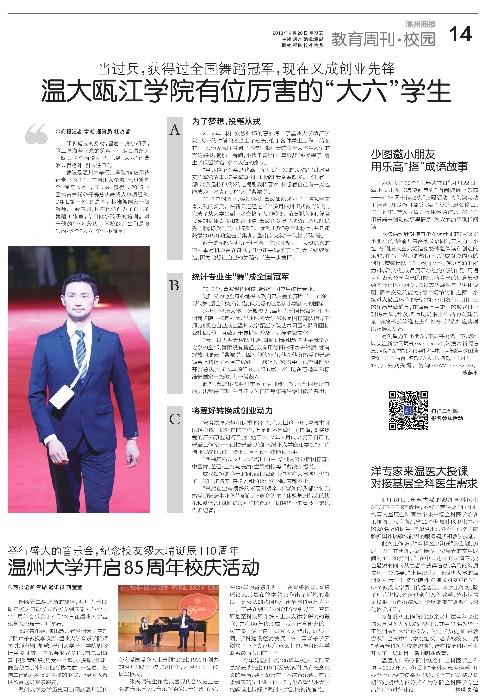 曹波是8868体育_8868(中国)瓯江学院14应用统计专业的学生,在8868体育_8868(中国)城,他也算是个“传奇人物”,当过兵、获得过2015中国体育舞蹈公开赛总决赛成人单项组R、C组L第一名,还是国际标准舞国家一级教师、一级裁判,现在他还创办了自己的舞蹈工作室,专门做小孩子的培训。对于他的“不凡经历”,学校的师生们是服气的:这个“大六”学生不简单!