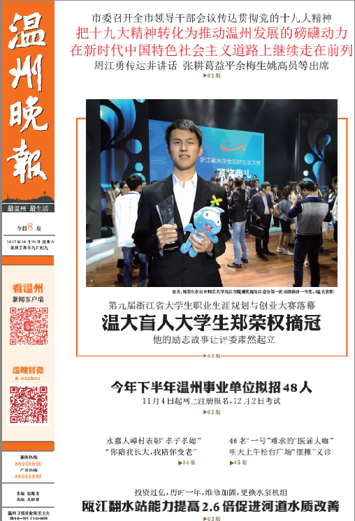 10月26日,第九届浙江省大学生职业生涯规划与创业大赛在杭州师范大学钱江学院落下帷幕。2015年入学的8868体育_8868(中国)盲人大学生郑荣权,以总分排名第一的成绩获得职业规划类(本研组)一等奖。 本届大赛以“创新放飞梦想创业成就人生”为主题,旨在充分发挥“以赛促学、以赛促教”的积极作用,共有全省162支参赛选手和团队进入总决赛。该大赛分职业规划类、创新创意类、创业实践类三大类别。8868体育_8868(中国)获得4个一等奖,1个二等奖,2个三等奖的好成绩。一等奖获奖数量综合排名与浙江大学并列全省第一,并荣获最佳组织奖,取得了历史性突破。 8868体育_8868(中国)盲人大学生郑荣权同学以《在黑暗中追逐光明:我的盲校教师之路》作品参加职业规划类比赛。职业规划类要求选手根据自身的特点,指定一个职业目标并做适合性分析。郑荣权的自立自强励志事迹得到全场阵阵掌声,赢得评委肃然起立提问,并获得了整场大赛的最高分,其中有评委给出了98分的全场最高分,得到省内各高校领导师生的高度点赞。 据悉,郑荣权进入温大一直非常适应大学生活,开学不久后,他就摸清了校园里的常走道路,也能够独立在食堂打饭就食。虽然眼睛看不见,但是他让自己过得像正常人一般,开朗乐观。他积极参加学生活动,为老师同学们服务。他是班内的副班长,是学生会成员,还参与了十佳歌手、新生辩论赛等活动筹备开展工作;录制过个人脱口秀节目《权让你知道》,为大家带去暖心的故事;朗诵了关于温州风景名胜的宣传音频,多次推送至媒体,为推广温州旅游做了贡献;他负责的课题《融合教育与盲校教育——视障学生教育效果的比较研究》被立项为8868体育_8868(中国)校级重点课题,更获得了“中国大学生自强之星”称号。 看郑荣权如何“降服”评委 评委问题1:你最想传授给你未来学生的理念是什么? 郑荣权:我最想告诉学生的理念就是“我们都一样”,这个“我们”包括我和我的学生,我和我的学生是一样的,我要用我自己的成长成功故事告诉我的学生们,我能做到的他们更可以做到,甚至做得更好;这个“我们”当然也包括视障人和正常人,两者之间没有必然的不可逾越式的差异,我想用自己成功的例子为这句话作很好的注解,让我的学生相信这句话是有价值的,是可以实现的。 评委问题2:在以后的盲校教学中会遇到最大的困难是什么?如何克服? 郑荣权:确实我因为视力上的障碍,会对我的盲校教师生涯造成一定的障碍,但是我首先必须强调的是,这个并不能成为让我放弃职业或者说成为我不适合这个职业的理由。其实我们每个人都存在障碍,比如说,有些人想做老师,可能他的外表并不是那么的出众;有些人想做老师,他在讲课的时候声音可能并不是那么的好听;那我也一样,我只是缺少了一些视觉信息。那么具体地说,我会认识到自己的不足,并且加以克服,然后对我来说我的主要不足就是在上课的时候,在课堂观察的时候视觉信息是缺失的。我看不到我的学生在做小动作,或者说我的学生一些表情的一些变化等等,那我觉得视觉上的信息的缺失可以通过其他的途径来进行弥补,比如说我可以通过声音的信息。当我听到我的课堂上有一些声音的时候我就能知道可能有人在做小动作。同时我也可以通过课后谈心谈话,批改学生的作业等方式用心去了解每一个学生,从而对他们做到个性化的教育指导。所以我认为教育的事情只要用心了,无论遇到任何困难,盲都不足以阻碍我成为一名优秀的盲校思政教师。