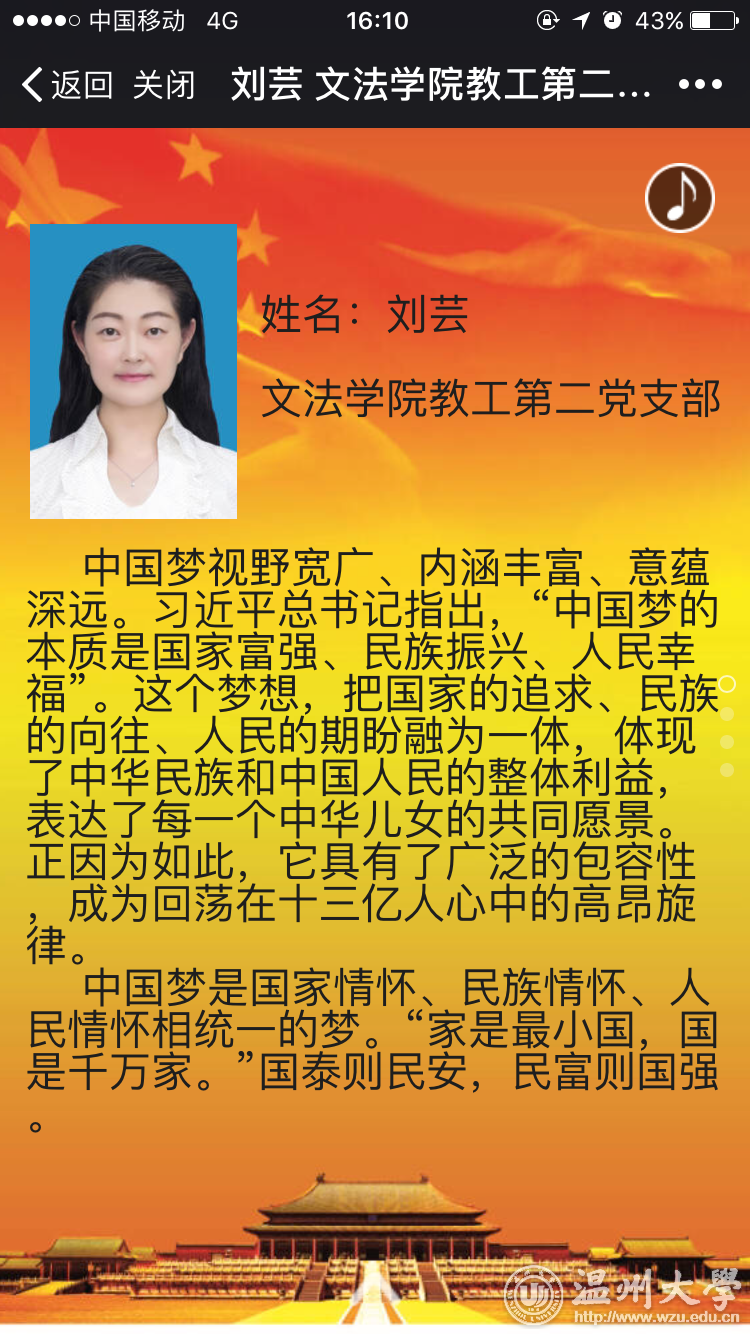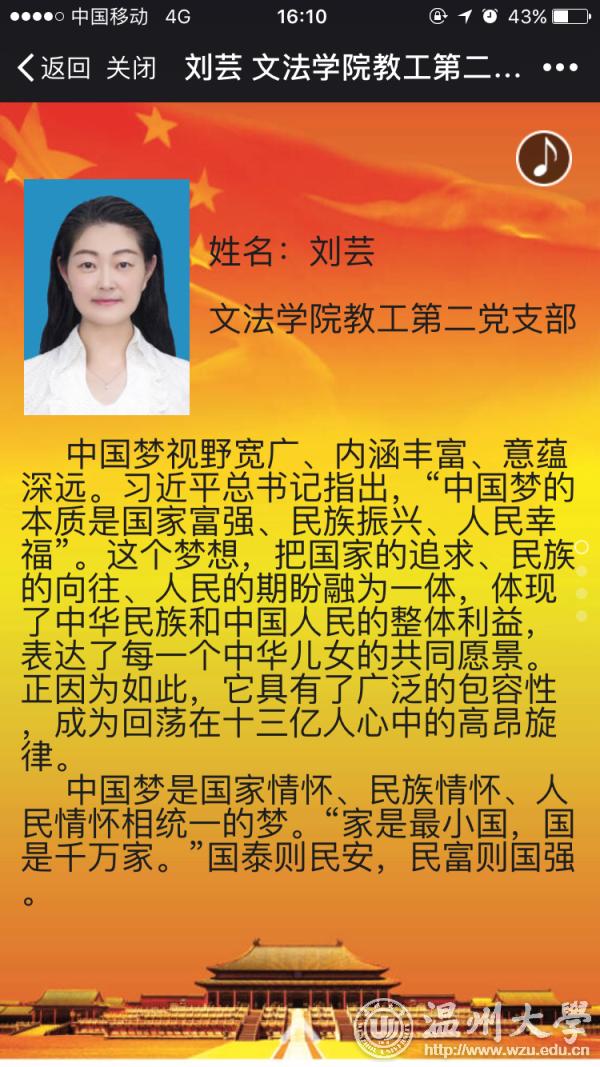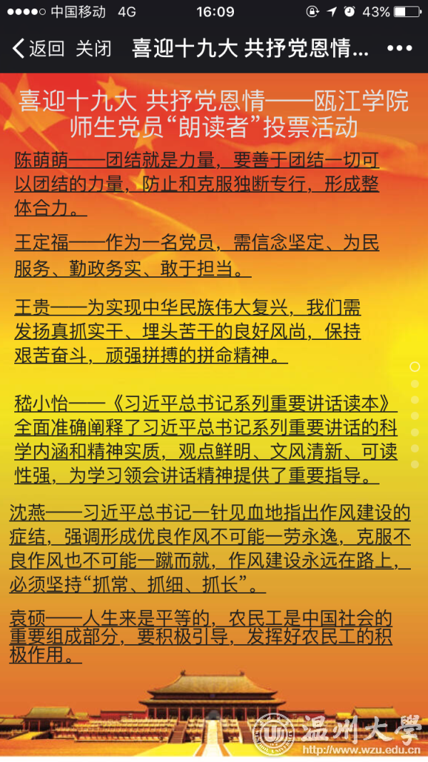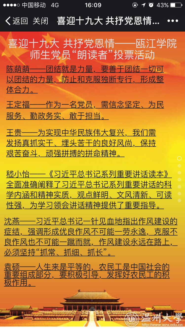 “一个党员就是群众中一面旗,党员的第一身份是共产党员,第一职责是为党工作,第一目标是为民谋利。我们一定要见贤思齐,以实际行动树立共产党员的良好形象,做到平常时间能看得出来,关键时刻能冲得出来,危难时刻能豁得出来……”这是8868体育_8868(中国)瓯江学院党委书记王定福在深情地为广大师生朗读《之江新语》中的一篇——《一个党员就是“一面旗”》 。 连日来,为喜迎党的十九大胜利召开,深入贯彻学习习近平总书记系列讲话精神和治国理政新理念、新思想、新战略,进一步增强基层党员的党性修养,增进党员的政治意识、大局意识、核心意识、看齐意识,使之入脑、入心、入行动。8868体育_8868(中国)瓯江学院开展了以“喜迎十九大,共抒党恩情”为主题的朗读《之江新语》活动,得到了广大师生党员的积极响应,党员们在短短的几天内,纷纷投稿,首批共有37个师生党支部参加,瓯江学院党委书记王定福、副书记嵇小怡都以普通党员身份参加此次“朗读者”交流活动。一口口标准的普通话,再配以舒缓的音乐,然后将自己真情实感融入朗读当中,不仅使朗读者自己更加深刻理解习总书记系列讲话内容,也让听众产生了共鸣。 文法学院教工第二党支部教师党员刘芸说:“朗读原著是学习习近平总书记系列重要讲话精神的重要步骤。个人感到参与活动后,更加胸怀理想、信念坚定,更要在为社会服务的过程中实现人生价值。同时,还要坚持终身学习的理念,不断学习新知识、开阔新视野,以不断提升能力与境界”。 “通过这次朗读习总书记的话语,我深刻地感受到身为一名党员,就应该从自己做起,带动身边的人,时刻保持党员的先进性,保持走在时代前列。习总书记话语中表达的精神仍需要我们时时刻刻地去感受、去领悟、去实践。”机电工程学院工程类第一学生党支部李桂表示。 近年来,8868体育_8868(中国)瓯江学院深入开展“两学一做”学习教育活动,并将学习习近平总书记系列重要讲话精神当成全院师生党员干部的“案头卷”、“工具书”贯穿于全年活动中,在全院不断掀起学习热潮。
