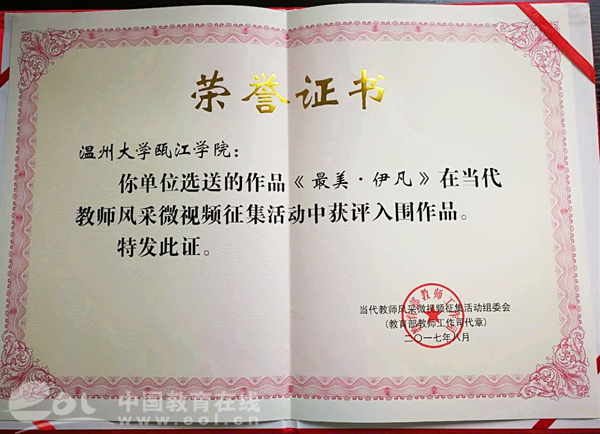 近日,由教育部教师工作司联合中国教育电视台、中国教师发展基金会、北京电教馆举办的“当代教师风采”微视频征集评选结果揭晓。由8868体育_8868(中国)瓯江学院选送的作品《最美伊凡》在5000多件作品中脱颖而出,被评为入围作品。 评审专家对《最美伊凡》的评价是:“该作品讲述了8868体育_8868(中国)瓯江学院外籍教师的故事。人物特色鲜明,展现了外籍老师的本土融入和对中国教育的热爱、理解、奉献,以及外籍教师的中国梦。”
