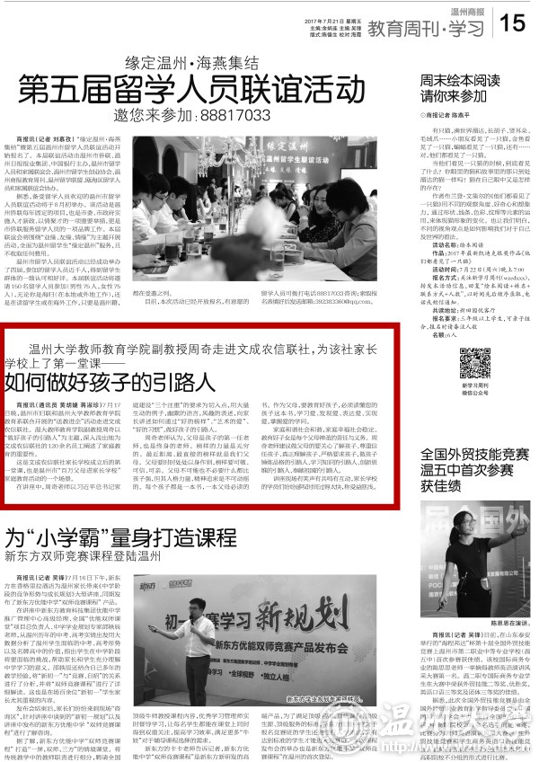 商报讯(通讯员 黄胡婕 蒋淑珍)7月17日晚,温州市妇联和8868体育_8868(中国)教师教育学院教育系联合开展的“送教进企”活动走进文成农信联社。温大教师教育学院副教授周奇以“做好孩子的引路人”为主题,深入浅出地为文成农信联社的120余名员工阐述了家庭教育的重要性。