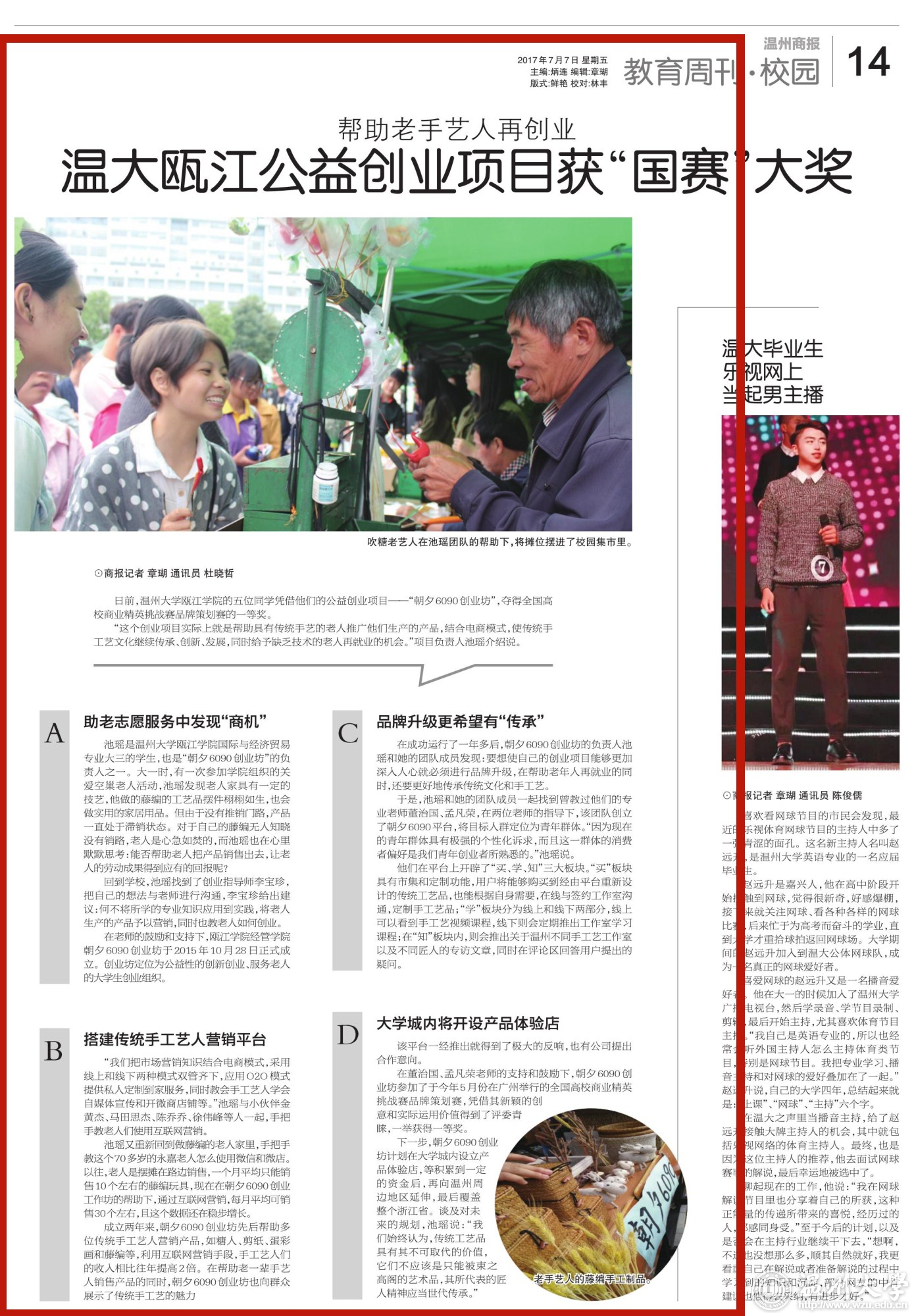 日前,8868体育_8868(中国)瓯江学院的五位同学凭借他们的公益创业项目——“朝夕6090创业坊”,夺得全国高校商业精英挑战赛品牌策划赛的一等奖。 “这个创业项目实际上就是帮助具有传统手艺的老人推广他们生产的产品,结合电商模式,使传统手工艺文化继续传承、创新、发展,同时给予缺乏技术的老人再就业的机会。”项目负责人池瑶介绍说。 助老志愿服务中发现“商机” 池瑶是8868体育_8868(中国)瓯江学院国际与经济贸易专业大三的学生,也是“朝夕6090创业坊”的负责人之一。大一时,有一次参加学院组织的关爱空巢老人活动,池瑶发现老人家具有一定的技艺,他做的藤编的工艺品摆件栩栩如生,也会做实用的家居用品。但由于没有推销门路,产品一直处于滞销状态。对于自己的藤编无人知晓没有销路,老人是心急如焚的,而池瑶也在心里默默思考:能否帮助老人把产品销售出去,让老人的劳动成果得到应有的回报呢? 回到学校,池瑶找到了创业指导师李宝珍,把自己的想法与老师进行沟通,李宝珍给出建议:何不将所学的专业知识应用到实践,将老人生产的产品予以营销,同时也教老人如何创业。 在老师的鼓励和支持下,瓯江学院经管学院朝夕6090创业坊于2015年10月28日正式成立。创业坊定位为公益性的创新创业、服务老人的大学生创业组织。 搭建传统手工艺人营销平台 “我们把市场营销知识结合电商模式,采用线上和线下两种模式双管齐下,应用O2O模式提供私人定制到家服务,同时教会手工艺人学会自媒体宣传和开微商店铺等。”池瑶与小伙伴金黄杰、马田思杰、陈乔乔、徐伟峰等人一起,手把手教老人们使用互联网营销。 池瑶又重新回到做藤编的老人家里,手把手教这个70多岁的永嘉老人怎么使用微信和微店。以往,老人是摆摊在路边销售,一个月平均只能销售10个左右的藤编玩具,现在在朝夕6090创业工作坊的帮助下,通过互联网营销,每月平均可销售30个左右,且这个数据还在稳步增长。 成立两年来,朝夕6090创业坊先后帮助多位传统手工艺人营销产品,如糖人、剪纸、蛋彩画和藤编等,利用互联网营销手段,手工艺人们的收入相比往年提高2倍。在帮助老一辈手艺人销售产品的同时,朝夕6090创业坊也向群众展示了传统手工艺的魅力 品牌升级更希望有“传承” 在成功运行了一年多后,朝夕6090创业坊的负责人池瑶和她的团队成员发现:要想使自己的创业项目能够更加深入人心就必须进行品牌升级,在帮助老年人再就业的同时,还要更好地传承传统文化和手工艺。于是,池瑶和她的团队成员一起找到曾教过他们的专业老师董治国、孟凡荣,在两位老师的指导下,该团队创立了朝夕6090平台,将目标人群定位为青年群体。“因为现在的青年群体具有极强的个性化诉求,而且这一群体的消费者偏好是我们青年 创业者所熟悉的。”池瑶说。 他们在平台上开辟了“买、学、知”三大板块。“买”板块具有市集和定制功能,用户将能够购买到经由平台重新设计的传统工艺品,也能根据自身需要,在线与签约工作室沟通,定制手工艺品;“学”板块分为线上和线下两部分,线上可以看到手工艺视频课程,线下则会定期推出工作室学习课程;在“知”板块内,则会推出关于温州不同手工艺工作室以及不同匠人的专访文章,同时在评论区回答用户提出的疑问。 大学城内将开设产品体验店 该平台一经推出就得到了极大的反响,也有公司提出合作意向。 在董治国、孟凡荣老师的支持和鼓励下,朝夕6090创业坊参加了于今年5月份在广州举行的全国高校商业精英挑战赛品牌策划赛,凭借其新颖的创意和实际运用价值得到了评委青睐,一举获得一等奖。 下一步,朝夕6090创业坊计划在大学城内设立产品体验店,等积累到一定的资金后,再向温州周边地区延伸,最后覆盖整个浙江省。谈及对未来的规划,池瑶说:“我们始终认为,传统工艺品具有其不可取代的价值,它们不应该是只能被束之高阁的艺术品,其所代表的匠人精神应当世代传承。” 相关链接: 温州商报:http://www.wzrb.com.cn/article794222show.html