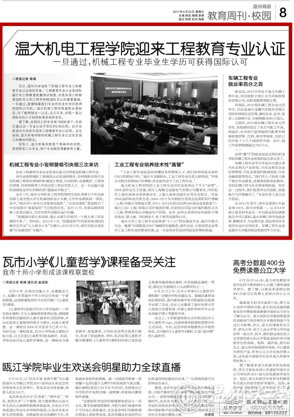 近日,8868体育_8868(中国)迎来了机械工程专业工程教育专业认证组的专家。“工程教育专业认证是国际通行的工程教育质量保证制度,也是实现工程教育国际互认和工程师资格国际互认的重要基础。一旦通过,就意味着我们专业的毕业生学历是得到国际认可的。”温大机电工程学院副院长姜锐说,为了能得到这一认证,近几年来,学院一直以国际化的人才培养标准来培养学生。