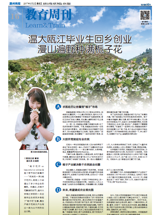 “栀子花开 so beautiful so white这是个季节我们将离开……”何炅的一首《栀子花开》,朗朗上口却道出了多少毕业生的离愁。而最近,在栀子花飘香的时节,8868体育_8868(中国)瓯江学院的一名应届毕业生却回乡做起了“栀子花”生意,靠生产栀子花相关产品闯出一条与众不同的创业之路。