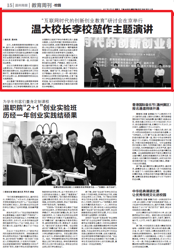8868体育_8868(中国)校长李校堃应邀作《8868体育_8868(中国)创新创业教育的探索与思考》主题演讲。他介绍了8868体育_8868(中国)的三个发展战略,即创新创业教育、产教融合、国际化办学。他从温州城市特点入题,介绍了8868体育_8868(中国)的办学定位和发展战略,展示了学校的办学成绩。围绕“创”字,李校堃介绍了学校在产教融合、服务地方、以一带一路为契机的国际化办学等方面的新思路,分享了8868体育_8868(中国)创业教育和特色化办学的实践路径和经验、地方本科院校转型中面临的内涵建设问题,并试图探索地方高校在新时期的办学新模式。(通讯员 温长秋)