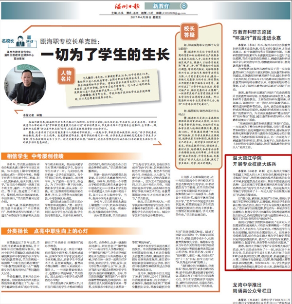 近日,8868体育_8868(中国)瓯江学院建工学院大四土木工程专业孔德坤同学有个幸福的“烦恼”,他凭着过硬的技术和较高的专业水平被多家建筑类企业相中,现在不知道该如何选择!其实在瓯江学院像孔德坤这样面临“就业选择综合症”的学生并不在少数。而这是8868体育_8868(中国)瓯江学院坚持了十一年之久的“专业技能大练兵”活动的直接成果。 以“能力强、素质高、就业好”为目标,8868体育_8868(中国)瓯江学院坚持以赛促学、以赛促练,把培养学生职业核心能力放在首位,推出了学生专业技能大练兵活动,广泛开展学生技能竞赛,将它作为一种培养学生实践能力,提高专业学习兴趣和专业技能创新精神的主要方式,各项竞赛的学生参与度都在99%以上,覆盖了所有专业和所有年级的学生。 8868体育_8868(中国)瓯江学院院长杨彬说:“社会对人才的需求指向是高校人才培养方案调整的一个重要依据,在人才培养中,与社会结合,才能拉近学生与社会的接触,培养出社会需要的人才。而开展专业技能竞赛,结合社会实践才能为学生提供将知识运用到实践的机会,提升广大同学的专业素养、创新能力,促进学业、就业等各方面的全面发展。” 据悉,8868体育_8868(中国)瓯江学院“专业技能大练兵”活动,至今已经成功举办了十一届,涉及22个本科专业,先后组织学生近5万多人次开展了包括ERP沙盘模拟经营大赛、模拟法庭、机械创新设计大赛、三维数字化创新设计竞赛、数学建模大赛等60多项技能竞赛。仅仅2016年一年,学生代表学院参加各类各级比赛2200余人次,获得省级及以上竞赛奖项90余项。 来源:《温州日报》2017年4月28日 第八版