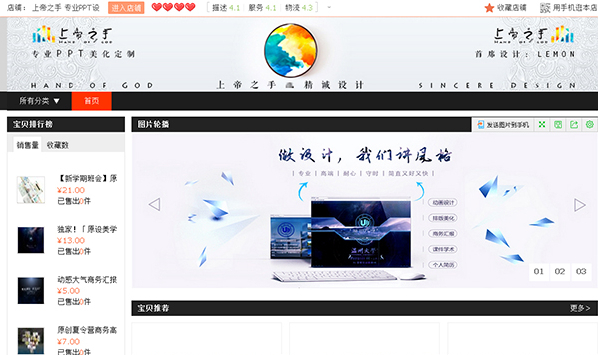 从2016年9月开始,20元的实用工作汇报系统、25元轻商务班会主题系列、35元大气晚会系列,这些设计个性化,性价比高的PPT,使她产品在演界网上倍受欢迎。据了解,上海我图网销售平台会专门联系并邀请她作为他们的兼职设计师,但由于工作和学习时间冲突,没能成为合作伙伴。但我图平台一直热情盛邀她进驻我图网,开一家我图店。