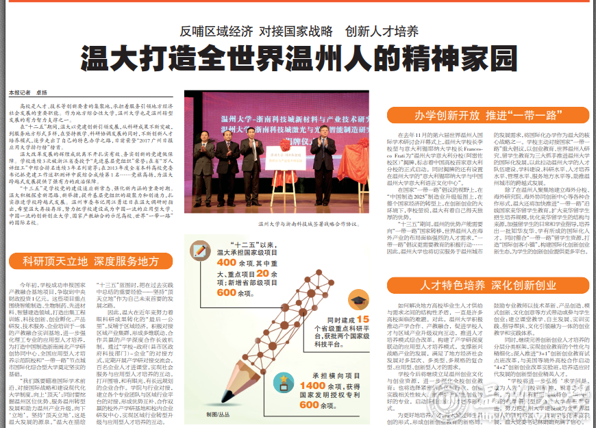 高校是人才、技术等创新要素的集聚地,承担着服务引领地方经济社会发展的重要职能。作为地方综合性大学,8868体育_8868(中国)也是温州转型发展的有力智力支撑之一。 在“十二五”期间,温大以党建创新引领发展。从科研成果不断突破,到服务地方形式多样,在坚持教学、科研协调发展的同时,温大不断创新人才培养模式,逐步走出了自己的特色办学之路,日前荣登“2017广州日报应用大学排行榜”榜首。 温大改革发展的辉煌成就离不开扎实有效、务实创新的党建做保障。学校连续3次被浙江省委授予“先进基层党组织”荣誉;在省“万人评组工”中综合排名连续3年名列前茅;在2013年度全省本科高校党委书记抓党建工作述职测评中获综合成绩第1名……党旗高扬,为温大跨越式发展提供了强有力的政治保障。 “十三五”是学校党的建设适应新常态、强化新内涵的重要时期。温大积极探索新思路、新举措,提升基层党组织的凝聚力和创造力,扎实推进学校跨越式发展。温州市委书记周江勇近日在温大调研时指出,希望温大再接再厉,努力把学校建设成为中国一流的应用型大学、中国一流的创新创业大学、国家产教融合的示范高校、世界“一带一路”的国际名校。 科研顶天立地 深度服务地方 “十二五”以来,温大承担国家级项目400余项,其中重大、重点项目20余项;新增省部级项目600余项。同时建成15个省级重点科研平台,获批两个国家级科技平台。承担横向项目1400余项,获得国家发明授权专利近600余项。在“2017广州日报应用大学排行榜”的“学术指数TOP100”“应用指数TOP100”中分别排名第5和第12。 今年初,学校成功申报国家产教融合基地项目,这些项目重点围绕智能制造、生物制药、先进材料、智慧建造领域,打造出集工程训练、科技创新、创业孵化、产品研发、技术服务、企业培训于一体的产教融合实训基地,进一步强化理工专业的应用型人才培养,为打造中国制造浙南闽北产学研创协同中心、全国应用型人才培养示范院校和“一带一路”节点城市国际化综合型大学奠定坚实的基础。 “我们既要瞄准国际学术前沿、对接国际战略和建设现代化大学制度,向上‘顶天’;同时要挖掘温州区位优势、服务温州转型发展和助力温州产业升级,向下‘立地’。坚持‘顶天立地’,这是温大发展的源泉。”温大在描绘“十三五”蓝图时把在过去实践中总结的重要经验——坚持“顶天立地”作为自己未来首要的发展之路。 因此,温大在近年来努力着眼科研成果转化的“最后一公里”,反哺于区域经济。积极对接区域产业集群,形成多维联动、合作共赢的产学深度合作长效机制。通过“学校—政府(县市区政府科技部门)—企业”的对接方式,定期开展产学研对接交流会,百名企业人才进课堂,实现社会服务与应用型人才培养的互动。打开围墙,和有眼光、有长远规划的企业合作。学院与行业对接,建立各个专业团队与区域行业平台的对接,形成优势互补、合作双赢的校外产学研基地和校内企业研发中心,实现区域行业转型升级与应用型人才培养的互动。 办学创新开放 推进“一带一路” 在去年11月的第六届世界温州人国际学术研讨会开幕式上,8868体育_8868(中国)校长李校堃与意大利锡耶纳大学校长Francesco Frati为“8868体育_8868(中国)意大利分校(阿雷佐校区)”揭牌,标志着中国高校首家意大利分校的正式启动。同时揭牌的还有设置在8868体育_8868(中国)的“意大利锡耶纳大学与中国8868体育_8868(中国)意大利语言文化中心”。 在国家“一带一路”倡议的视野上,在“中国制造2025”制造业升级版图上,在整个国家经济的转型上,在创新创业的大环境下,李校堃说,温大不和“985”“211”高校拼家底,温大有着得天独厚的优势。 “十三五”期间,温州的优势产能需要向“一带一路”国家转移,世界温州人在海外产业的布局面临强烈的人才需求,“一带一路”倡议更需要教育的积极行动……因此,8868体育_8868(中国)也将切实服务于温州城市的发展需求,将国际化办学作为温大的核心战略之一。学校主动对接国家“一带一路”重大倡议,以创业教育、世界温州人研究、留学生教育为三大抓手推进8868体育_8868(中国)的国际化发展,以此拉动8868体育_8868(中国)的人才队伍建设、学科建设、科研水平、人才培养水平、管理水平、服务地方水平等,助推温州城市的跨越式发展。 除了在温州人聚集地建立海外分校、海外研究院、海外协同创新中心等各种合作形式,为温州人的海外产业布局提供人才支持。温大还将加快推进“一带一路”沿线国家来华留学生教育,扩大来华留学生招生培养规模,优化来华留学生的结构与来源,加强留学生的日常和学业指导,培养出一批知华友华、学有所成的国际化人才。同时整合“一带一路”留学生资源,打造“国际创客小镇”,构建国际化创新创业新生态,为学生的创新创业提供更多平台。 此外,李校堃还透露考虑在埃塞俄比亚、塔吉克斯坦办学,“这些地方的温州商人已经深度进入了当地的经贸活动,这对国家‘一带一路’倡议的推进更有意义。” 人才特色培养 深化创新创业 如何解决地方高校毕业生人才供给与需求之间的结构性矛盾,一直是许多高校面临的难题。对此,温大深入实施“卓越”人才培养计划,致力于培养“重实践、强创新、能创业、懂管