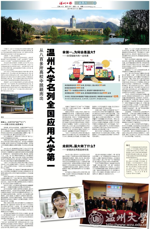 同时,将独立学院、民办本科高校与公办普通本科高校进行同一指标体系下的评价是“2017广州日报应用大学排行榜”的另一大特色。进入800强的本科高校包括449所公办普通本科高校,209所独立学院,135所民办本科高校,5所中外合作办学高校,2所内地与港澳台合作办学高校。 排名前100的高校中有三所非公办高校,其中温州人较为熟悉的宁波诺丁汉大学和浙江大学城市学院分别位居65位和81位。另一所中外合作办学的西交利物浦大学排名第46。 ? ?? 去年,以学科发展水平作为主要评价指标的“2016广报大学一流学科排行榜”,同样出自GDI之手,它给高考考生在在选择大学学科方面给予一定的针对性指导。GDI指出今年的应用大学排行榜在考生填报特色应用大学方面,同样可以给予一定的参考。 拿第一,为何会是温大? ——四项指数均有一定积累 在解决了榜单中不见“985”“211”的疑惑之后,第二个疑问也随之而来——拿全国第一的为何会是温大? 榜单出炉的那一刻是火热的,但接下来更需要的是冷思考。记者联系到温大政策法规处副处长孙良好,他对温大获榜首的感言更多表达的是一种压力:“在榜单里面很多高校也都很有实力,有些高校在某一领域实力是非常强的,也可以说国内是顶尖的,这次被排为榜首对我校来讲是很好的肯定,但更多的是压力和鞭笞。”他表示,立足温州这片独特的大地上办学,温大在应用型高校办学实践中确实办出了自己特色和优势。“但是依然还有很多不足,这也是我们要努力的地方,今后也将一直朝着这方向坚定不移地前行。” “2017广州日报应用大学排行榜”通过采集887所本科高校2011年以来的数据进行统计分析,榜单通过应用指数、学术指数、声誉指数和二次评估指数四个维度,经过加权计算得出综合指数,作为排名依据。 记者从GDI了解到,应用指数是“2017广州日报应用大学排行榜”的重要创新,它重点评价高校在社会服务方面所做的贡献。应用指数由专利转让、人才就业质量等多个指标构成,重点从科研创新成果转化及人才培养质量两个方面衡量大学办学成效。再加上由科研产出等指标构成的学术指数、反映大学在社会认同度的声誉指数、由国外内大学排行榜的分级赋值构成的二次评估指数,“四个一级指标从高校成果产出、科学研究和服务社会的等多方面对这些大学进行综合评价。”研制团队成员周详博士介绍。 8868体育_8868(中国)在“应用指数TOP100”和“学术指数TOP100”中分别排名第12和第5。声誉指数和二次评估指数在综合榜前十的学校中均排名第2。 据悉,“十二五”以来温大承担国家级项目400余项,其中重大、重点项目20余项;新增省部级项目600余项。同时建成15个省级重点科研平台,获批两个国家级科技平台。承担横向项目1400余项,获得国家发明授权专利近600余项。 同时,在生物医药、智能电器、皮革化工、纳米材料、绿色节能、海涂围垦和软弱土地基处理、生态环境修复技术等方面,学校的科研成果广泛应用于相关行业企业,创造了良好的经济效益和广泛的社会效益,不断增强对经济社会发展的拉动力。 翻看温大“十二五”以来取得的成绩,四项指数均位列靠前也就不奇怪了。 此外,温大在近年来努力着眼科研成果转化的“最后一公里”。积极对接区域产业集群,形成多维联动、合作共赢的产学深度合作长效机制。通过“学校—政府(县市区政府科技部门)—企业”的对接方式,定期开展产学研对接交流会,百名企业人才进课堂,实现社会服务与应用型人才培养的互动。打开围墙,和有眼光、有长远规划的企业合作。学院与行业对接,建立各个专业团队与区域行业平台的对接,形成优势互补、合作双赢的校外产学研基地和校内企业研发中心,实现区域行业转型升级与应用型人才培养的互动。 今年初,学校成功申报国家产教融合基地项目,争取到中央财政投资1亿元。这些项目重点围绕智能制造、生物制药、先进材料、智慧建造领域,打造出集工程训练、科技创新、创业孵化、产品研发、技术服务、企业培训于一体的产教融合实训基地,进一步强化理工专业的应用型人才培养,为打造中国制造浙南闽北产学研创协同中心、全国应用型人才培养示范院校和“一带一路”节点城市国际化综合型大学奠定坚实的基础。 这些措施,一方面把市场上的新鲜空气带进校园,一方面也能让围墙内的智慧实实在在地支撑产业发展。产出的是社会影响力,也是社会认同。因此,与同类型大学相比,温大在武书连排行榜、武汉大学邱均平排行榜、中国最好大学排行榜、校友会网排行榜等榜单中也有较为不错的排名。 综合以上,8868体育_8868(中国)虽然在四项指数上的评价并非最高,但各指数经过加权得出的综合指数8868体育_8868(中国)评价最高。“这说明在这个榜单上很多高校都有突出的办学特色,有着不俗的表现。8868体育_8868(中国)能拿到综合高分,也说明大学在应用办学的各方面都有了一定的积累,得到了社会的认可,而社会认可也反映了一所大学的声誉。”孙良好说。 走前列,温大做了什么? ——拼就拼应用型战略布局 2014年,温大《面向中小企业的地方本科高校应用型人才培养创新与实践》获国家级高等教育教学成果奖一等奖;2015年,温大获批浙江省加强应用型建设试点本科院校。此外,学校还先后获得国家创业型人才培养温州模式创新