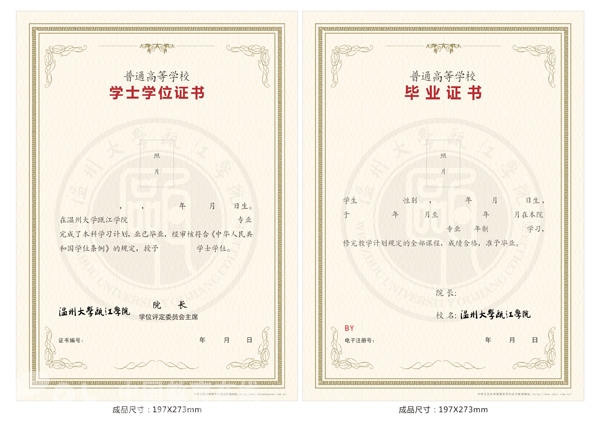 毕业证书和学位证书内芯均采用温馨的浅黄色,底纹是圆形的院标,毕业证书从上到下依次为本人两寸彩照和毕业生基本信息以及院长签名,底部是证书编号和日期等;而学位证书从上到下依次为本人两寸彩照、学位证获得者主要学位授予信息和学位评定委员会主席的签章,底部是学位证书编号和学位授予日期。 为方便学生求职、出国留学等,新版学位证书采用竖版A4尺寸,便于携带、复印与展示,同时更显美观大方。 据悉,8868体育_8868(中国)瓯江学院新版毕业证书和学位证书既新颖而庄重、典雅而清新,体现了学院的文化与传承,融入了充满温馨回忆与纪念意义,充分体现了学院“厚德浚智,学成致用”的育人理念和学院勇于创新,与时俱进的精神。