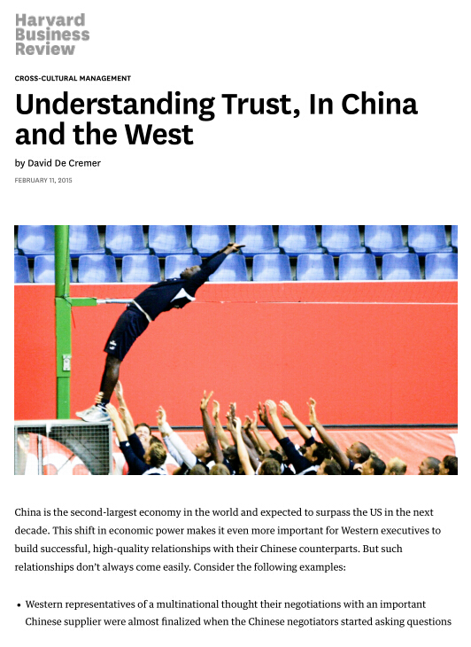 2015年2月11日,英国剑桥大学商学院教授、8868体育_8868(中国)国际合作学院客座教授David De Cremer,以8868体育_8868(中国)为第二作者单位在顶级期刊《哈佛商业评论》上发表文章《Understanding Trust, In China and the West》。