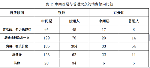 再次,消费观是人们对消费品的主观评价,通常会在条件允许的情况下主导消费者的消费行为,因此常常表现出一种趋同性。对于特定的消费群体来说,消费观常常表现出一种趋同性,因此我们可以对消费观作出一定的区分。在此,我们将消费观分为两种:一种是个性化的甚至是炫耀性的消费观,以消费的个性和风格来突出自己的身份或者与众不同的品味;而另一种则是实用主义的消费观,这一类消费者在消费时,更看重商品本身的实用价值。在问及“假如给您足够的钱让您购买物品您会选择如何购买”这一问题时(见表2),如果将追求个人喜好、品位和档次算做个性化的或炫耀性的消费观,将其余类型视为实用主义消费观,从中可以看到,中间群体中追求实用的人数达到33%,而追求品位和炫耀性消费的人为40%。再与普通大众比较,明显地发现中间群体在个性化和炫耀性消费观方面都明显高于普通人平均水平,高出18%,而在实用性消费观方面则低于普通大众9%。